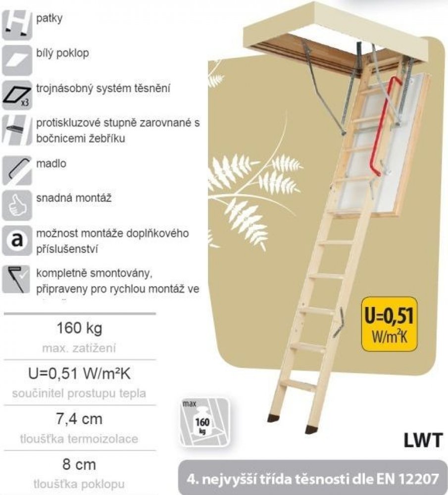 Půdní schody FAKRO LWT jsou navrženy speciálně pro prostory s vysokým rozdílem teplot mezi obytnými a půdními prostory. Díky nim jsou tepelné ztráty v podkroví výrazně omezené. Výška rámu 22 cm a ztrojená tepelná izolace poklopu s koeficientem U = 0,51 W/m2K představují nejlepší zateplení pro dosažení energeticky úsporného prostoru.
