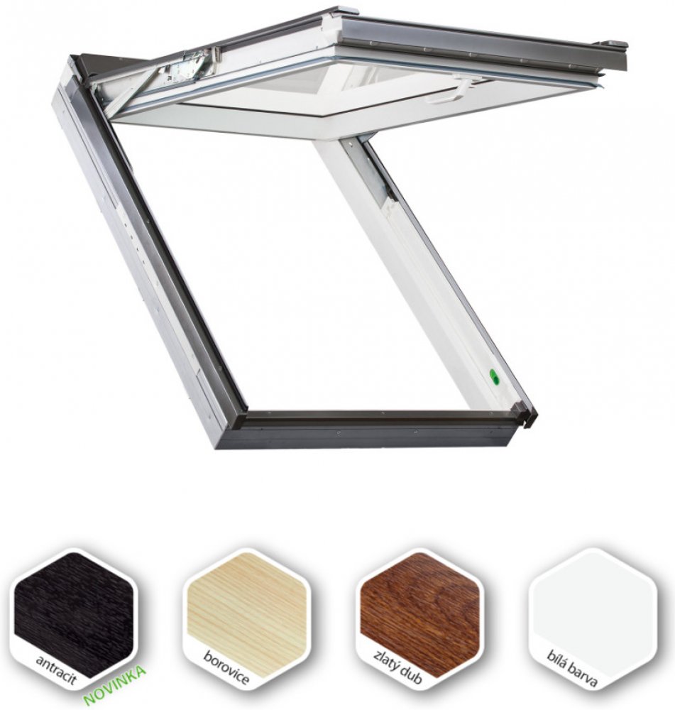 V novém výklopně-kyvném okně preSelect MAX se křídlo vyklápí v úhlu až 45°, což je téměř o 30 % více než v předchozí verzi okna. Takový rozsah otevření umožňuje ještě větší využití dodatečně vytvořeného prostoru v podkroví. Inovativní systém kování zaručuje realizaci pouze jedné zvolené funkce otevírání křídla a jeho plnou stabilitu, a to jak při výklopné, tak při kyvné funkci; oba dva způsoby otevírání jsou oddělené. To zaručuje vysokou životnost výrobku a také provozní bezpečnost. Pohodlná obsluha pomocí kliky umístěné v dolní části křídla. Klika Elegant umožňuje spárové větrání ve dvou polohách. Volba funkce otevírání okna pomocí snadno přístupného přepínače preSelect, který se nachází v dolní části rámu. Jednoduchý způsob čištění vnějšího skla a nasazování markýzy díky západce blokující otevřené křídlo v pootočené poloze o 180°. Široká nabídka vnitřních a vnějších doplňků vč. příslušenství. Zvýšená odolnost proti vloupání - systém topSafe. Rozsah montáže 15-55° (u speciální verze 55-85°). Plast odolává vlhkosti a nevstřebává ji, okno má dlouhou životnost a odolává korozi. Určeno do prostor, ve kterých se dlouhodobě vyskytuje zvýšená vlhkost vzduchu (koupelny, lázně, prádelny).Okno určené do kuchyní a koupelen. Určeno do prostor, kde se periodicky objevuje zvýšená vlhkost vzduchu (kuchyně, koupelny).