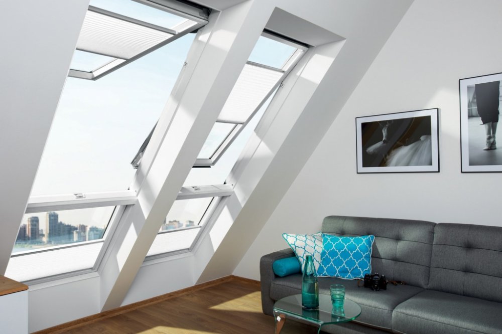 - Střešní okno nové generace vybavené dvěma oddělenými funkcemi otevírání – výklopnou a kyvnou.