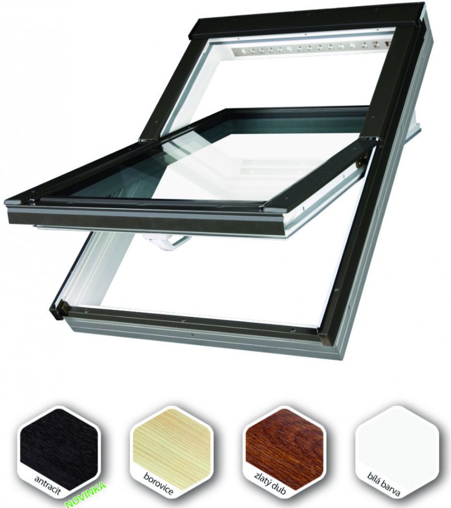 Oblíbená konstrukce oken s panty umístěnými uprostřed okna, vhodná do místností se zvýšenou vlhkostí. Pohodlné ovládání okna pomocí kliky umístěné v dolní části křídla. Klika umožňuje spárové větrání ve dvou polohách. Snadné mytí vnějšího skla a stažení markýzy díky západce blokující křídlo v pootočené poloze o 180°. Zvýšená odolnost proti vloupání - systém topSafe. Použitá technologie thermoPro zvyšuje kvalitu a parametry střešních oken, což má vliv na zvýšení energetické účinnosti, odolnosti a těsnosti oken, a také usnadňuje jejich montáž. Široký výběr těsnicího lemování umožňuje instalaci okna prakticky v libovolné střešní krytině. Bohatá nabídka doplňků a příslušenství. Možnost instalace elektrického ovládání. Rozsah montáže 15-90°.