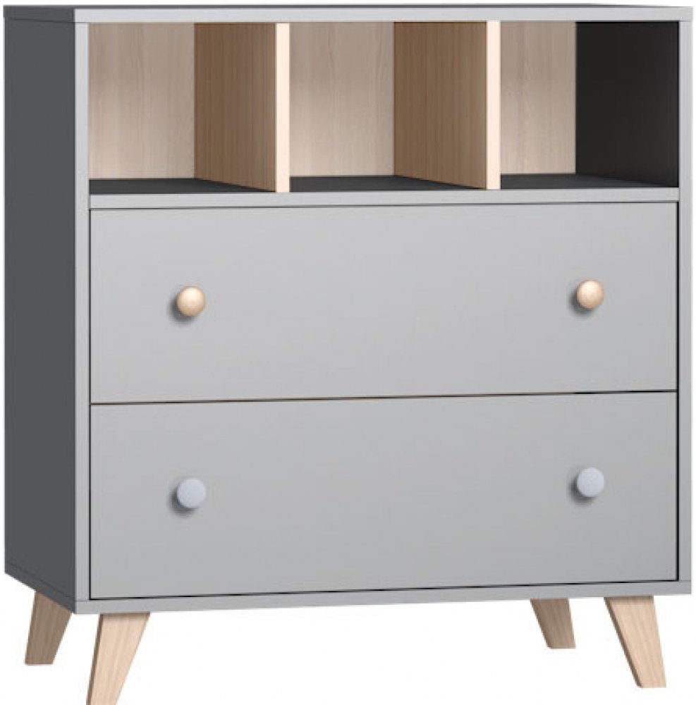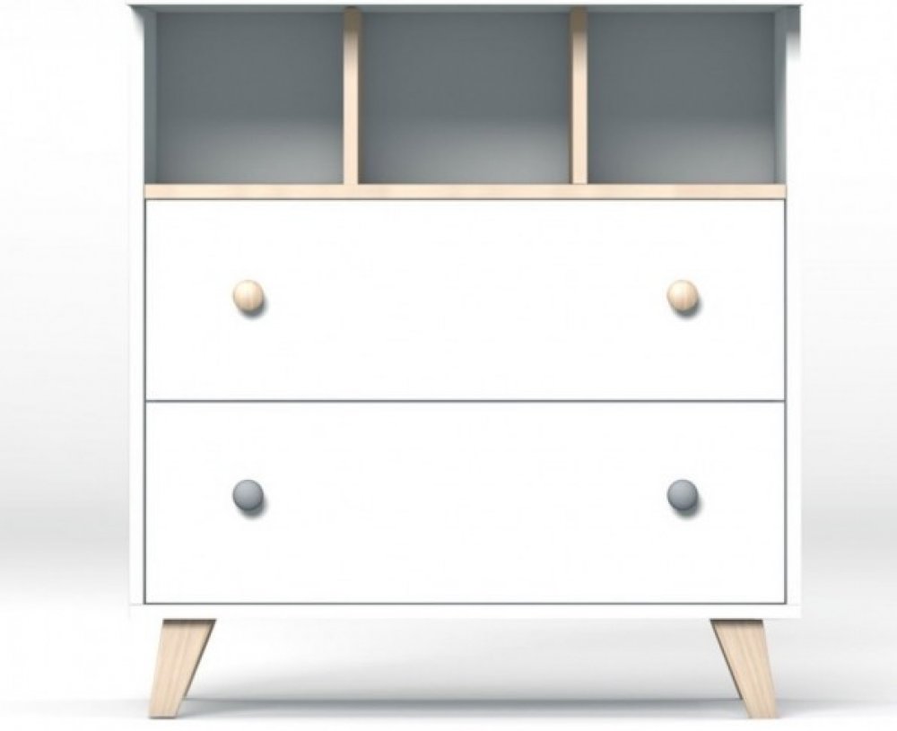 Komoda poskytne dostatek místa na vše potřebné pro Vaše miminko, v horní části otevřená polička pro velmi frekventované potřeby nebo pro věcí, po kterých potřebujete sáhnout ospalá poslepa, níže dva šuplíky chránící věci před prachem. Komoda je optimálně vysoká pro pohodlné přebalování. Součástí dodávky je přebalovací nástavec, který později můžete odmontovat a komodu dále používat bez něj.