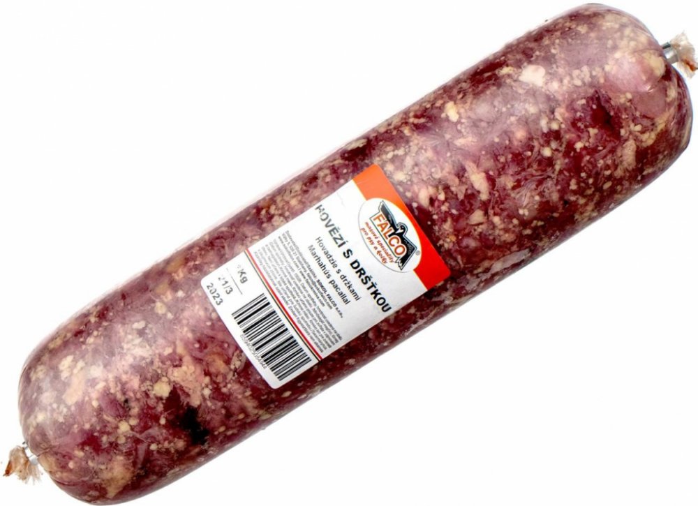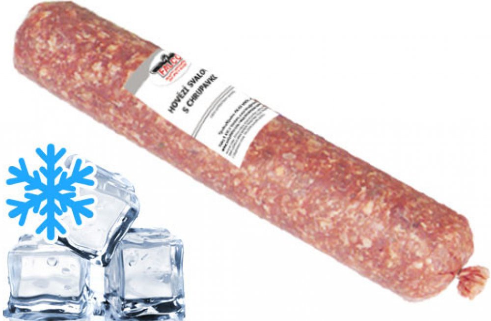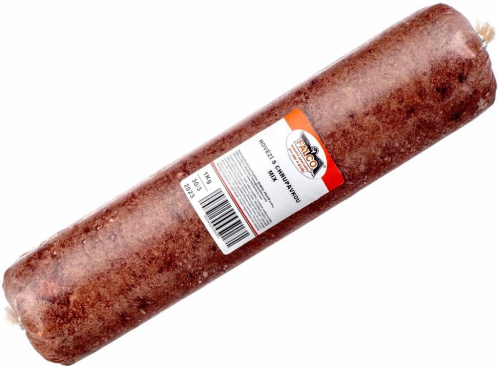 Mražené mleté hovězí maso s chrupavkou a droby v salámovém balení.