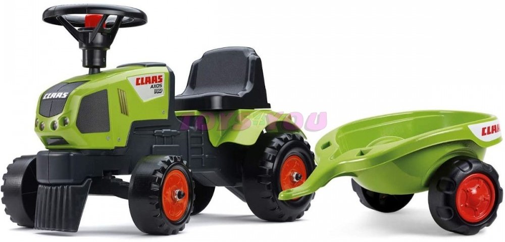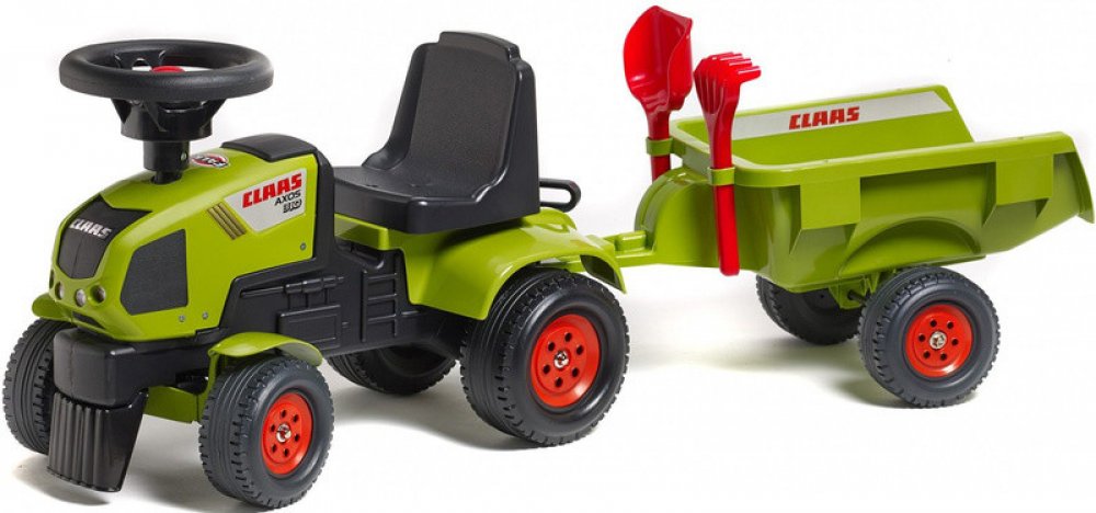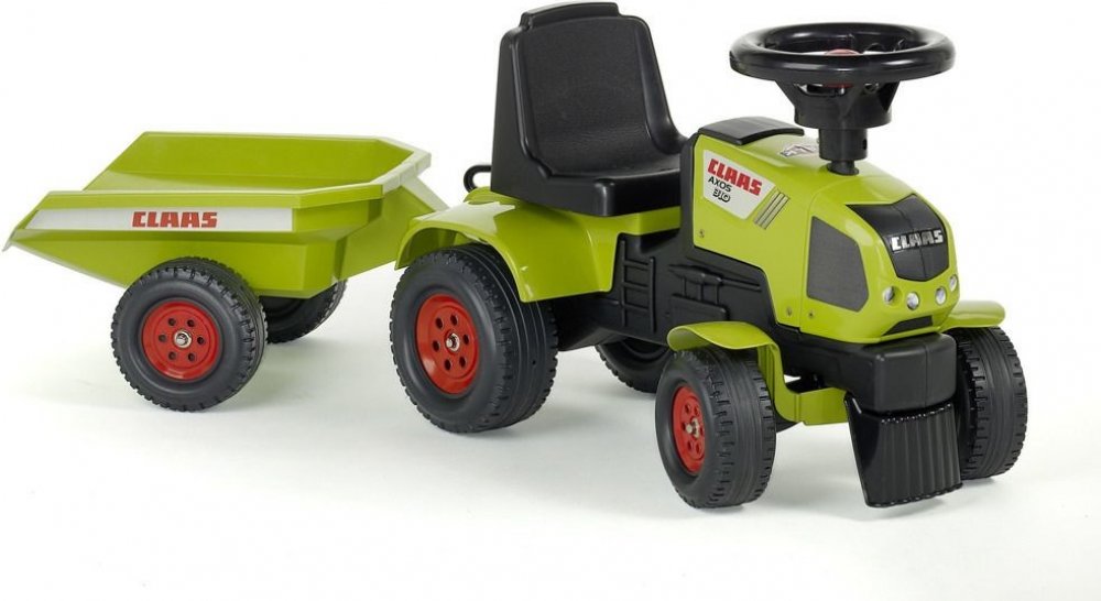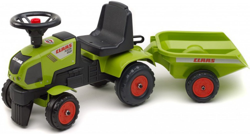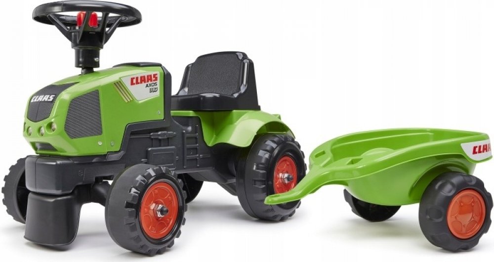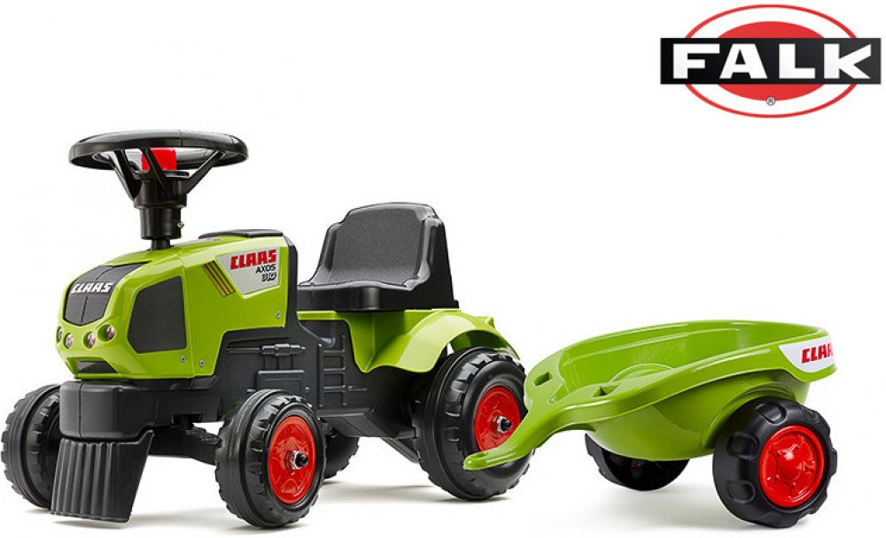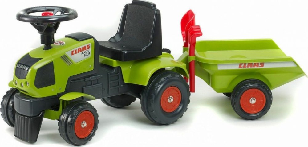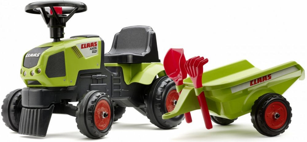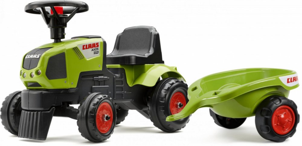 Dětské odrážedlo FALK - Dětské odrážedlo Baby Claas Axos s vlečkou, lopatkou a hráběmi. Kopie známé značky traktoru z plastu. Odrážedlo je vyrobené ve Francii z vysoce kvalitního odolného plastu s ohledem na bezpečnost dětí. Pro děti od 1 do 3 let.