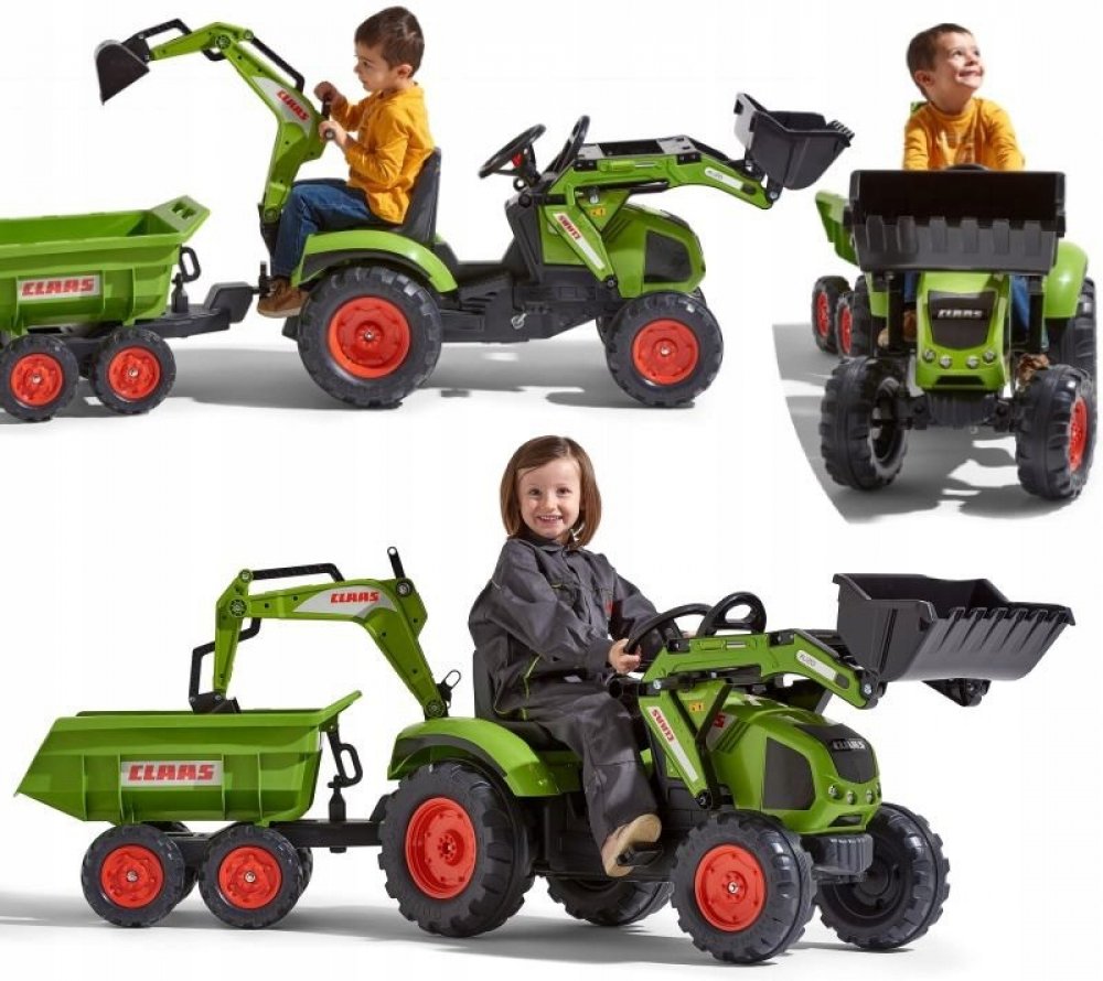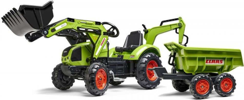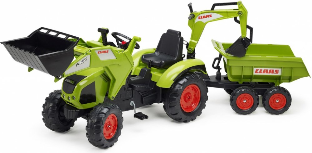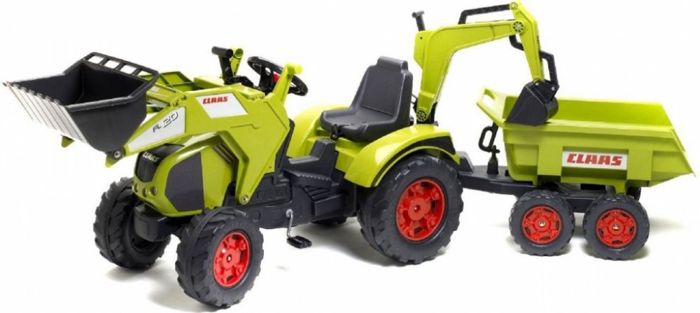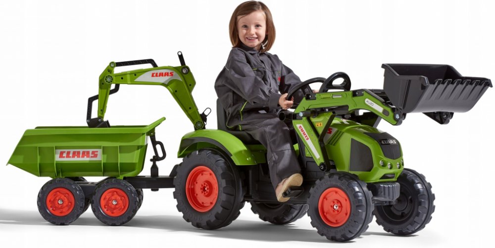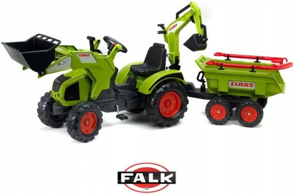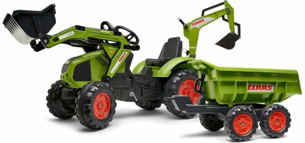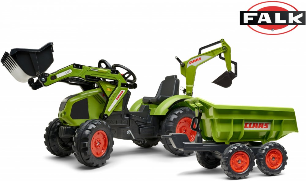 FALK Šlapací traktor 1011Z Claas Axos s nakladačem, rypadlem a vlečkou, výrobce FALK. Realistická kopie známé značky traktoru.