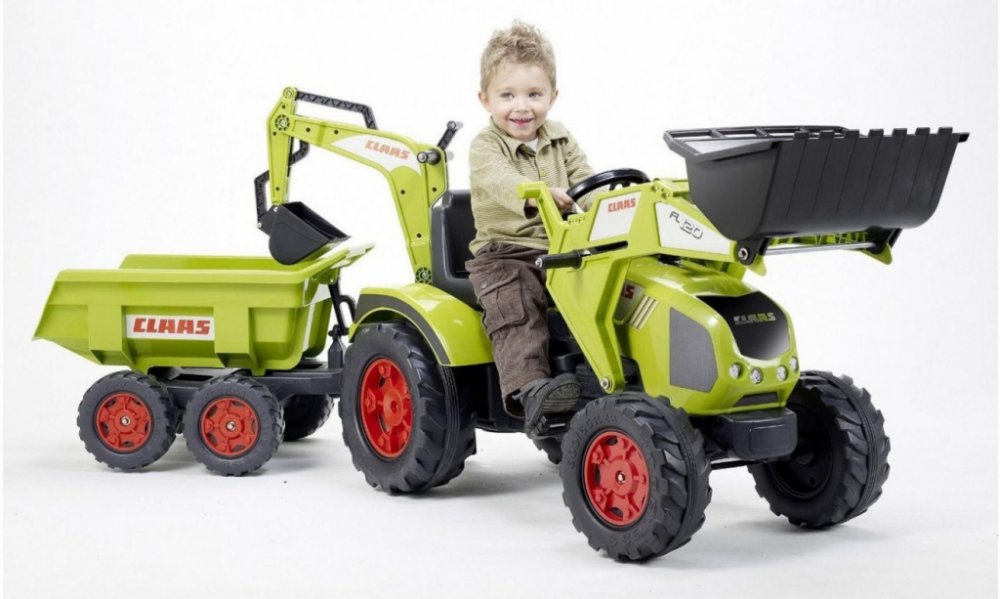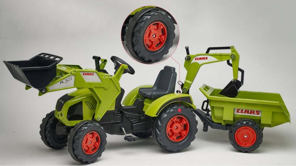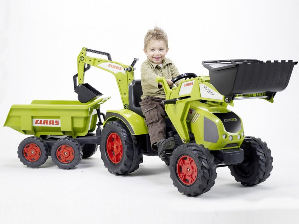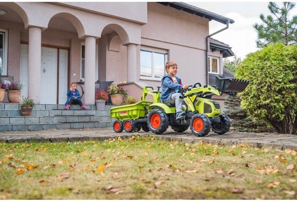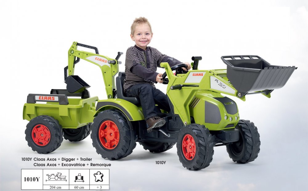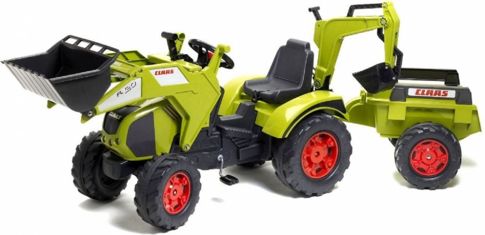 FALK Šlapací traktor 1011Z Claas Axos s nakladačem, rypadlem a vlečkou, výrobce FALK. Realistická kopie známé značky traktoru.