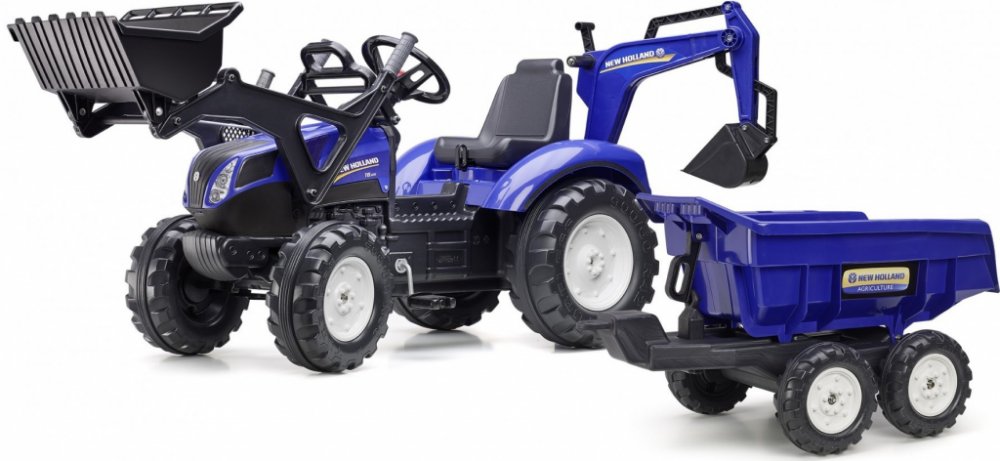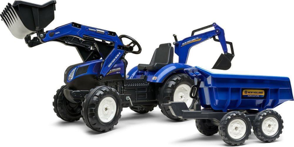 FALK Šlapací traktor New Holland T8 s nakladačem rypadlem a maxi vlečkou modrý