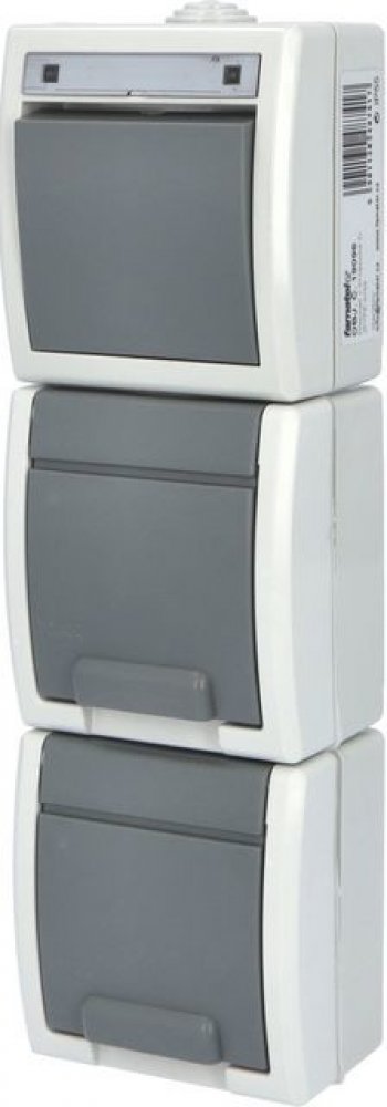 ATLAS 19096 IP55 Přepínač č.6 + zásuvka 2x 2P+PE, 2-násobná svisle s ochr. kolíkem, na povrch, šedý.