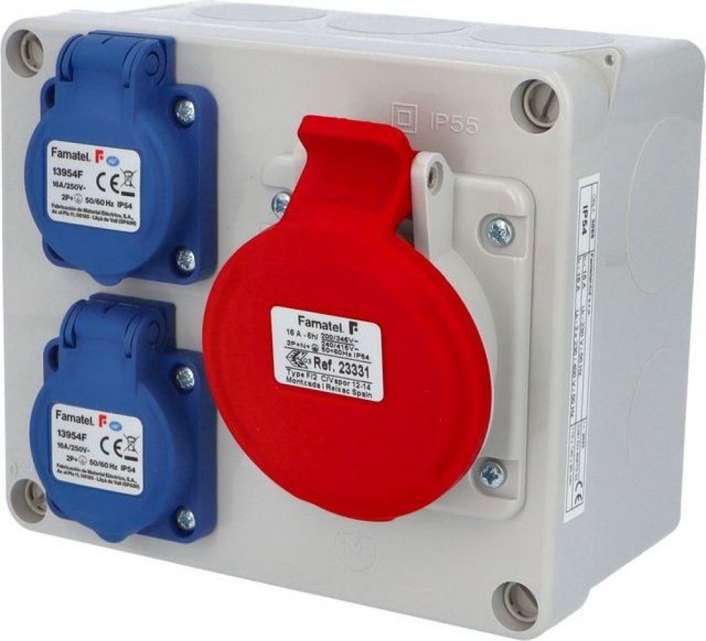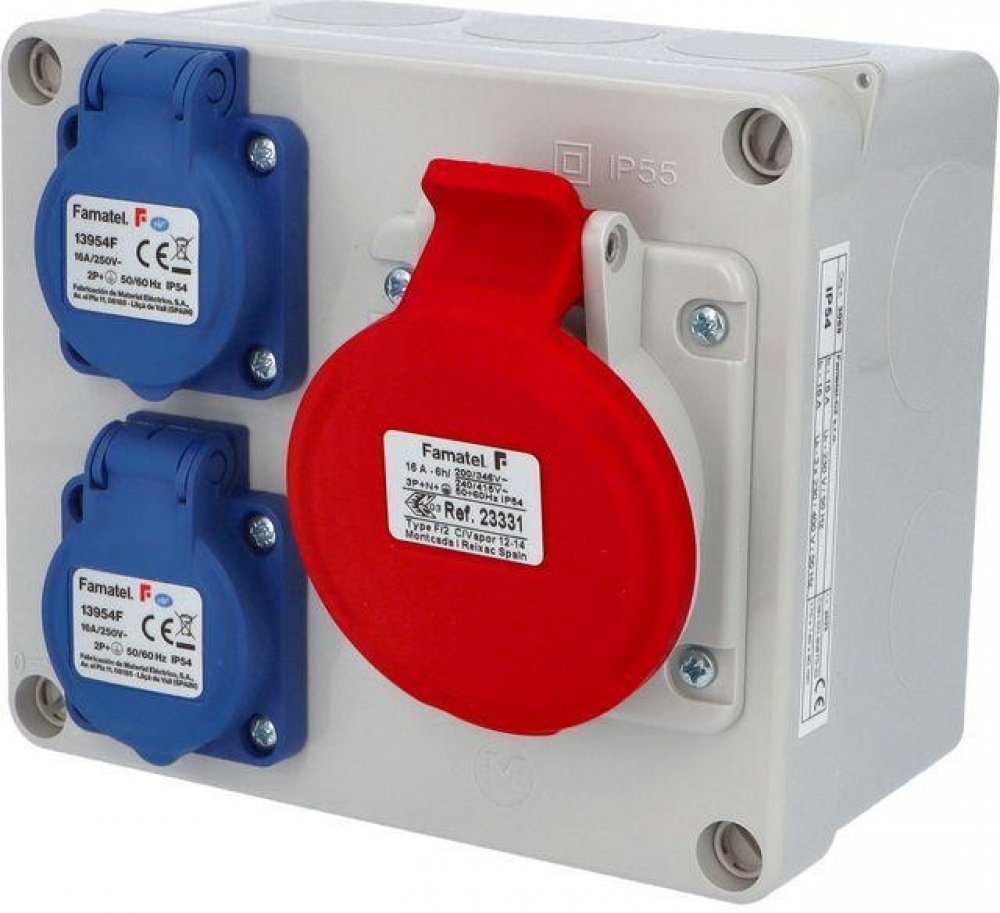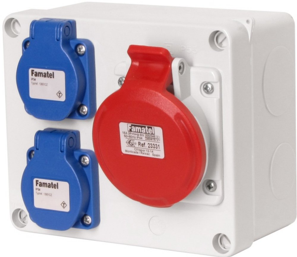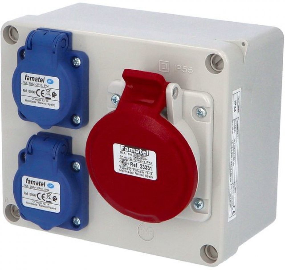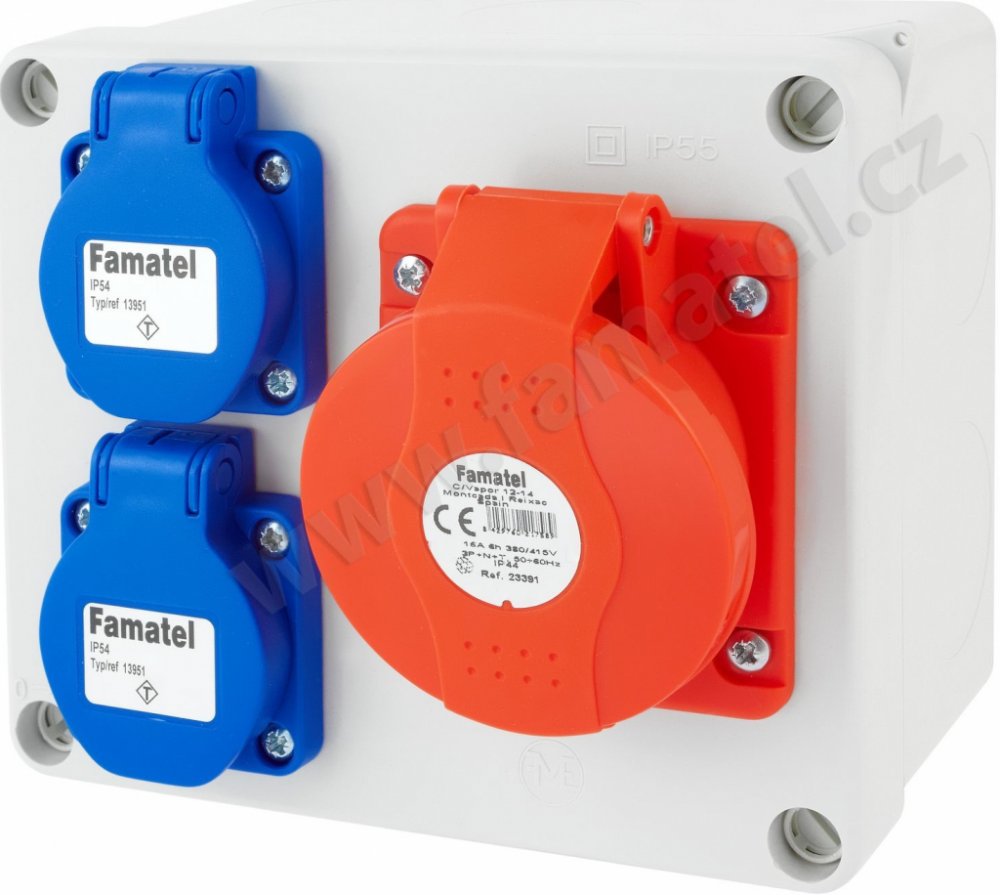 Zásuvková krabice 3069 s krytím IP54 je vybavena 2 zásuvkami 230V/16A a 1 zásuvkou 400V/16A/5pól. Vyrobena z UV odolného, samozhášivého plastu, nabízí mechanickou odolnost IK08 a snadnou montáž na povrch. Rozměry 170 × 140 × 90 mm, vhodná pro třífázové i jednofázové připojení pomocí šroubových svorek.