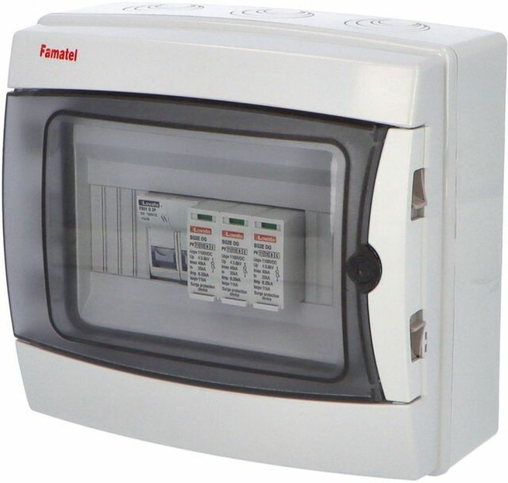 Fotovoltaická rozvodnice FAMATEL SolarBOX fr004L IP65 chránící DC vedení o max. napětí 1000V, pro 1 string. Osazena jistícími a ochrannými prvky: 1 x pojistkový odpojovač 1000V DC, 2P 10x38, bez pojistek, 1 x svodič přepětí Lovato 1100V DC typ II, použité pouzdro: 39081 - 215x235x110mm, barva: světle šedá. Fotovoltaická rozvodnice (rozváděč nízkého napětí) SolarBOX fr004L IP65 chránící DC vedení o max. napětí 1000V, pro 1 string. Osazena jistícími a ochrannými prvky: 1 x pojistkový odpojovač 1000V DC, 2P 10x38, bez pojistek, 1 x svodič přepětí Lovato 1100V DC typ II, použité pouzdro: 39081 - celkem k dispozici 8mod. míst, rozměry: 215x235x110mm, plastová, materiál ABS, IK08, zkouška žhavou smyčkou 650°C, bezhalogenová a UV odolná, montáž na povrch, barva: světle šedá, rozsah teplot -25°C + 70°C, aplikované normy: ČSN EN 61439-2 ed. 2, balení: 1ks (fólie), PE svorkovnice součástí (2x16 mm2 + 12x10 mm2) / N svorkovnice součástí (2x16 mm2 + 12x10 mm2), hladké boky (stěny) - pro vyvrtání otvoru a osazení vývodkou (vrchní a spodní strana má stěny s předlisovanými vstupy pro vyvrtání vstupního otvoru a následného osazení příslušnou vývodkou), dodáno s průvodní dokumentací: štítkem rozváděče, návodem pro obsluhu a montáž, krycím listem (charakteristiky rozhraní), protokolem o kusové zkoušce, ES prohlášením o shodě, schématem zapojení a zkouškou oteplení pro rozváděče nízkého napětí. Pro montáž na hořlavé podklady je nutné použít nehořlavou podložku. Recyklační poplatek je zahrnut v ceně výrobku.