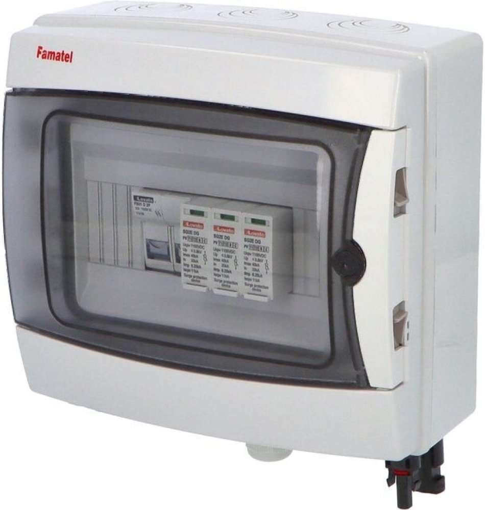 Fotovoltaická rozvodnice FAMATEL SolarBOX fr006L IP65 chránící DC vedení o max. napětí 1000V, pro 1 string. Osazena jistícími a ochrannými prvky: 1 x pojistkový odpojovač 1000V DC, 2P 10x38, bez pojistek, 1 x svodič přepětí Lovato 1100V DC typ II, 1x konektor MC4+, 1x konektor MC4-, 1x kabelová průchodka M20, použité pouzdro: 39081 - 215x235x110mm, barva: světle šedá. Fotovoltaická rozvodnice (rozváděč nízkého napětí) SolarBOX fr006L IP65 chránící DC vedení o max. napětí 1000V, pro 1 string. Osazena jistícími a ochrannými prvky: 1 x pojistkový odpojovač 1000V DC, 2P 10x38, bez pojistek, 1 x svodič přepětí Lovato 1100V DC typ II, 1xkonektor MC4+, 1xkonektor MC4-, 1x kabelová průchodka M20, použité pouzdro: 39081 - celkem k dispozici 8mod. míst, rozměry: 215x235x110mm, plastová, materiál ABS, IK08, zkouška žhavou smyčkou 650°C, bezhalogenová a UV odolná, montáž na povrch, barva: světle šedá, rozsah teplot -25°C + 70°C, aplikované normy: ČSN EN 61439-2 ed. 2, balení: 1ks (fólie), PE svorkovnice součástí (2x16 mm2 + 12x10 mm2) / N svorkovnice součástí (2x16 mm2 + 12x10 mm2), hladké boky (stěny) - pro vyvrtání otvoru a osazení vývodkou (vrchní a spodní strana má stěny s předlisovanými vstupy pro vyvrtání vstupního otvoru a následného osazení příslušnou vývodkou), dodáno s průvodní dokumentací: štítkem rozváděče, návodem pro obsluhu a montáž, krycím listem (charakteristiky rozhraní), protokolem o kusové zkoušce, ES prohlášením o shodě, schématem zapojení a zkouškou oteplení pro rozváděče nízkého napětí. Pro montáž na hořlavé podklady je nutné použít nehořlavou podložku. Recyklační poplatek je zahrnut v ceně výrobku.