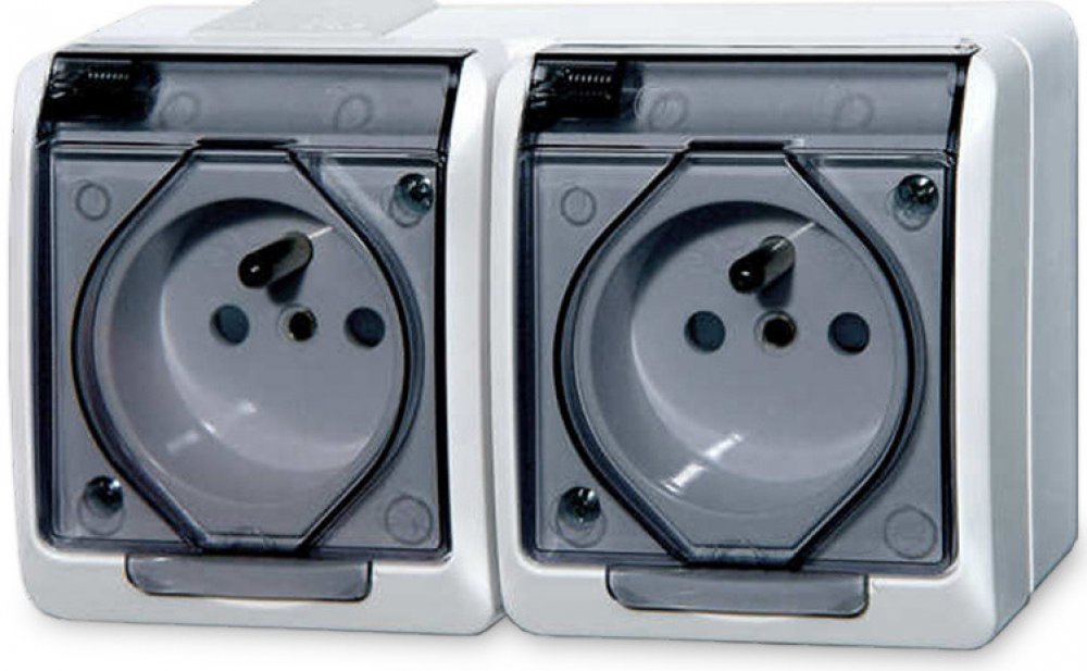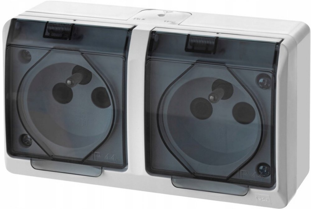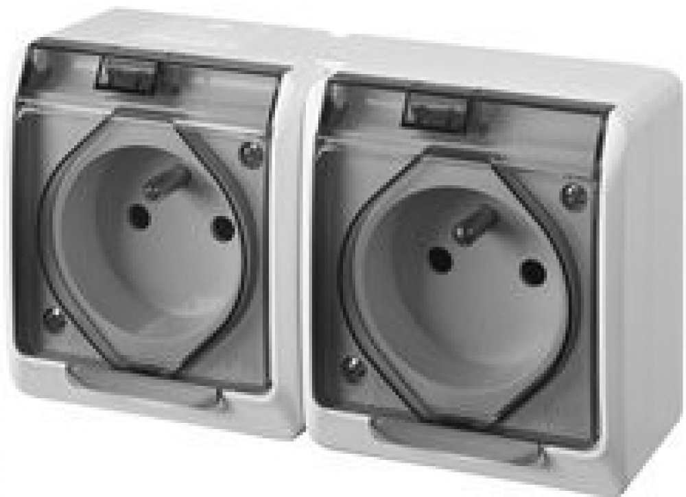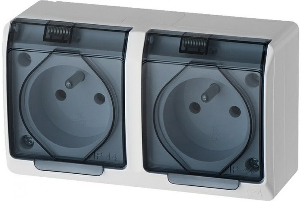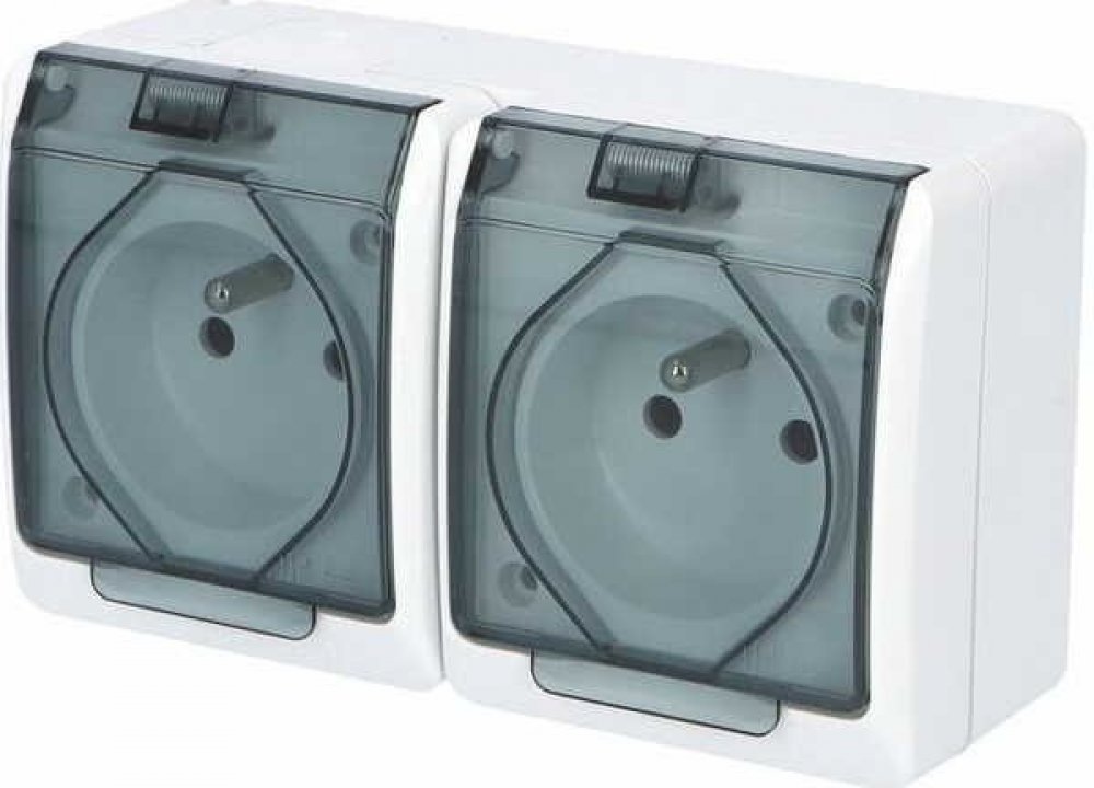 Zásuvka dvojnásobná vodorovná bílá průhledná Famatel. Zásuvka slouží k instalaci na povrch s krytím proti vodě a vlhkosti. Vhodné použití pro průmyslovou instalaci do garáže, chaty, chalupy, zahrady, sklepy, suterény.