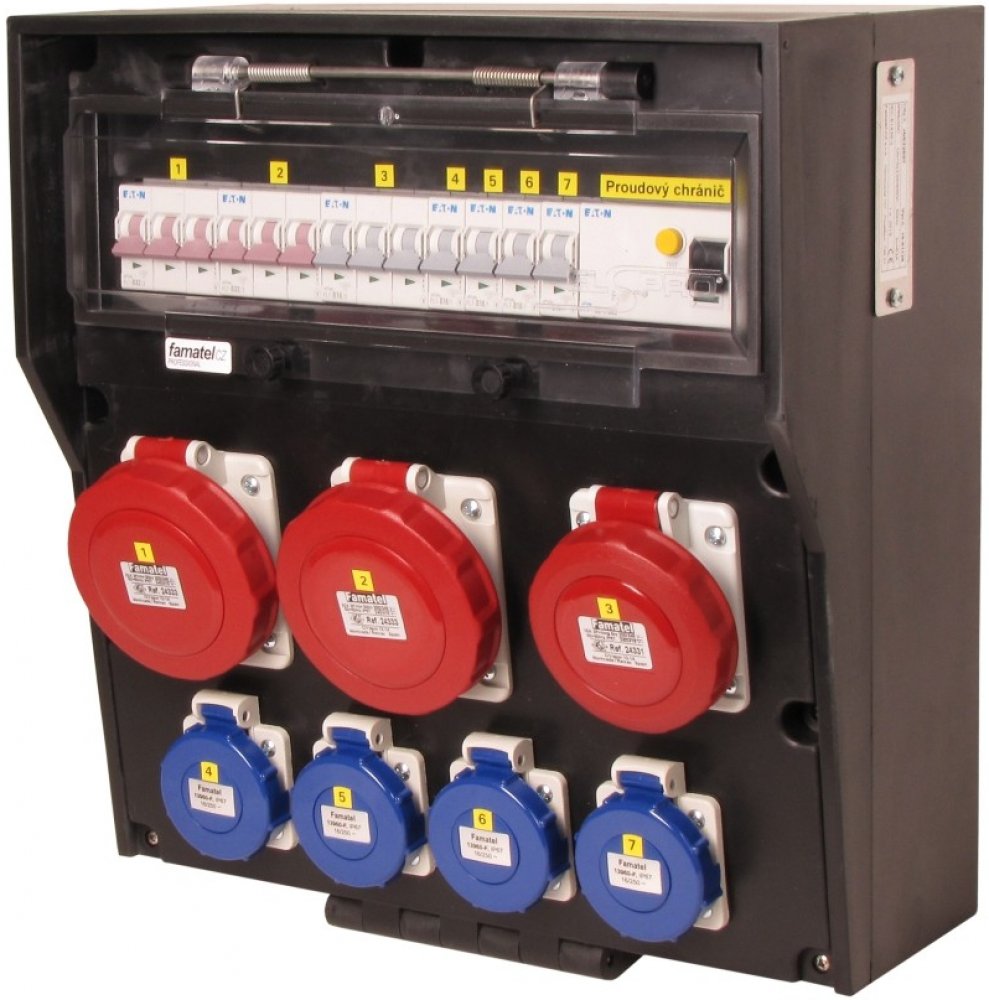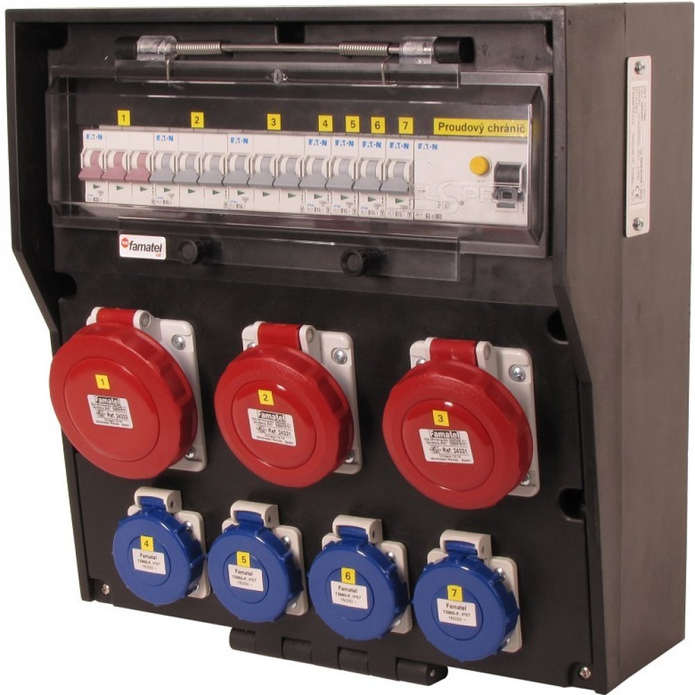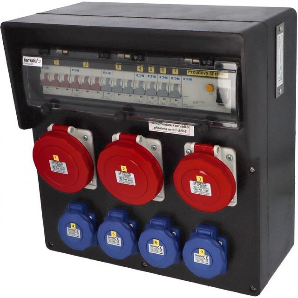 Zásuvková skříň FAMATEL rb632697-RB40102000.1 /4030 IP65 jištěná s chráničem 63/4/003, zásuvky 4x230V, 1x16/5, 2x32/5, přístroje EATON 10kA: 4xPL7-B16/1, 1xPL7-B16/3, 2xPL7-B32/3, PF7-63/4/003 na vstupu, použité pouzdro: 4030 - 380x370x170mm, barva: černá. Vysoce odolná zásuvková skříň (rozváděč nízkého napětí) rb632697-RB40102000.1 /4030 IP65 jištěná s chráničem 63/4/003, zásuvky 4x230V/16A (s ochranným kolíkem dle ČSN), 1x400V/16A/5pól, 2x400V/32A/5pól , jistící přístroje EATON 10kA: 4xPL7-B16/1, 1xPL7-B16/3, 2xPL7-B32/3, PF7-63/4/003 na vstupu (citlivost na reziduální proud 30mA), použité pouzdro: 4030 - celkem k dispozici 18mod. míst, rozměry: 380x370x170mm, tvrzená guma (butyl), zkouška žhavou smyčkou 960°C, bezhalogenová a UV odolná, montáž na povrch, barva: černá, rozsah teplot -20°C +85°C, aplikované normy: IEC 61439-3 (Rozváděče nízkého napětí - Část 3: Rozvodnice určené k provozování laiky (DBO), balení: 1ks (fólie), polykarbonátové transparetní okénko, jistící prvky EATON, PE svorkovice součástí (6x16mm2), N svorkovice součástí (6x16mm2), hladké stěny pro vyvrtání vstupního otvoru a následné osazení příslušnou vývodkou (pro CYKY 5x6; 4x10; 5x10 => M25; pro CYKY 5x16 => M32), max. připojitelný vstupní kabel = 4x25 nebo 5x16 (Cu), dodáno s průvodní dokumentací: štítkem rozváděče, návodem pro obsluhu a montáž, krycím listem (charakteristiky rozhraní), protokolem o kusové zkoušce, ES prohlášením o shodě, schématem zapojení a zkouškou oteplení pro rozváděče nízkého napětí.