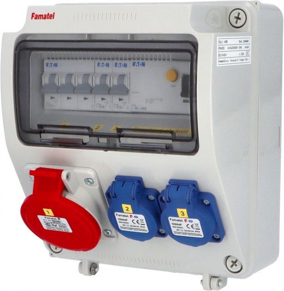 Zásuvková skříň FAMATEL v165-ZSF20100000.1 /3957 IP54 jištěná s chráničem 40/4/003, zásuvky 2x230V, 1x16/5, přístroje EATON 10kA: 2xPL7-B16/1, 1xPL7-B16/3, PF7-40/4/003 na vstupu, použité pouzdro: 3957 - 245x215x155mm, barva: světle šedá. Zásuvková skříň (rozváděč nízkého napětí) FAMATEL v165-ZSF20100000.1 /3957 IP54/IP20C jištěná s chráničem 40/4/003, zásuvky 2x230V/16A (s ochranným kolíkem dle ČSN), 1x400V/16A/5pól, jistící přístroje EATON 10kA: 2xPL7-B16/1, 1xPL7-B16/3, PF7-40/4/003 na vstupu (citlivost na reziduální proud 30mA), použité pouzdro: 3957 - celkem k dispozici 9mod. míst, rozměry: 245x215x155mm, plastová, materiál ABS, IK08, zkouška žhavou smyčkou 650°C, bezhalogenová a UV odolná, montáž na povrch, barva: světle šedá, rozsah teplot -25°C +85°C, aplikované normy: IEC 61439-3 (Rozváděče nízkého napětí - Část 3: Rozvodnice určené k provozování laiky (DBO), balení: 1ks (fólie), zásuvky na 230V/16A s ochranným kolíkem dle ČSN, polykarbonátové okénko, jistící prvky EATON, PE svorkovnice součástí (6x16mm2), N svorkovnice součástí (6x16mm2), hladké stěny (bez prolisů) pro vyvrtání vstupního otvoru a následné osazení příslušnou vývodkou (pro CYKY 5x6; 4x10; 5x10 => M25; pro CYKY 5x16 => M32), max. připojitelný vstupní kabel = 4x25 nebo 5x16 (Cu), dodáno s průvodní dokumentací: štítkem rozváděče, návodem pro obsluhu a montáž, krycím listem (charakteristiky rozhraní), protokolem o kusové zkoušce, ES prohlášením o shodě, schématem zapojení a zkouškou oteplení pro rozváděče nízkého napětí. Recyklační poplatek je zahrnut v ceně výrobku.