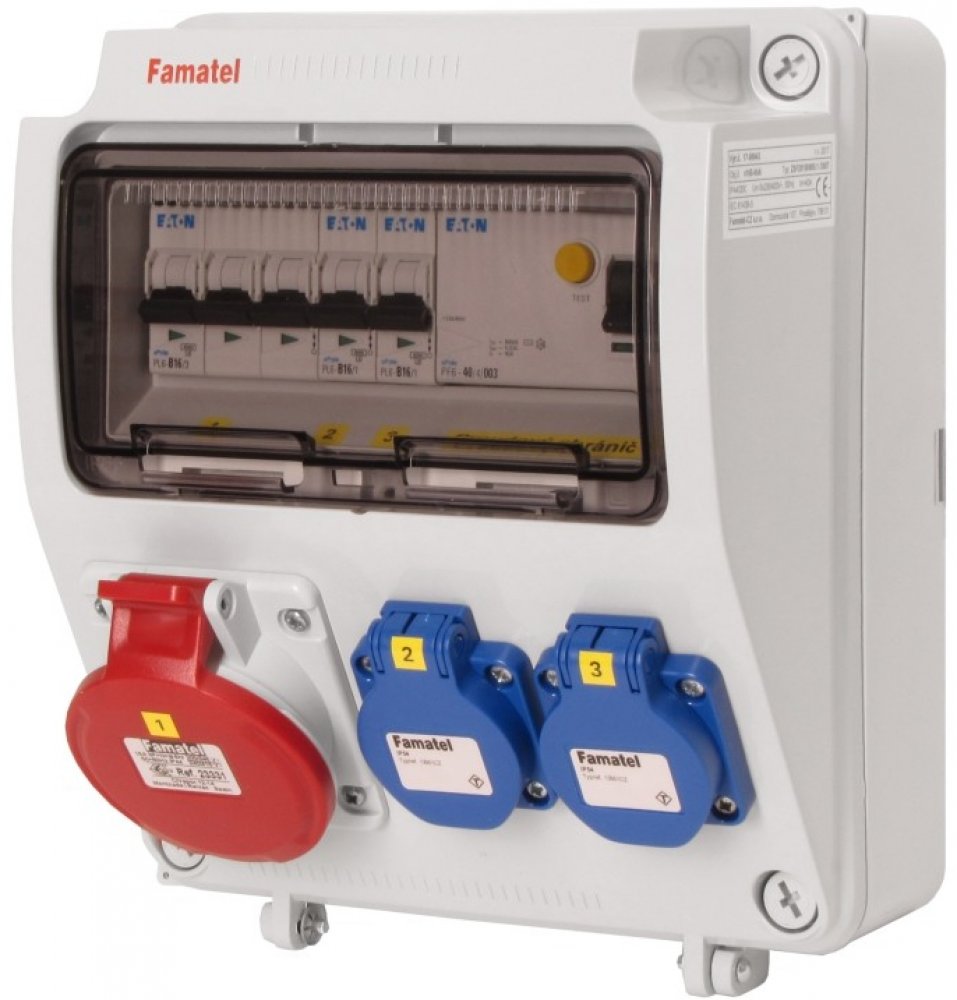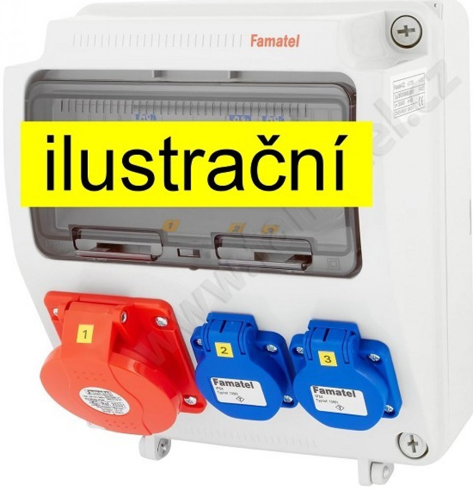 zásuvky: 2x 230V/16A, 1x 400V/16A/5p