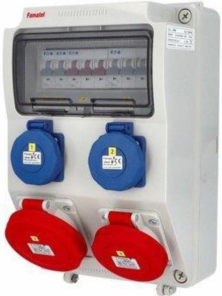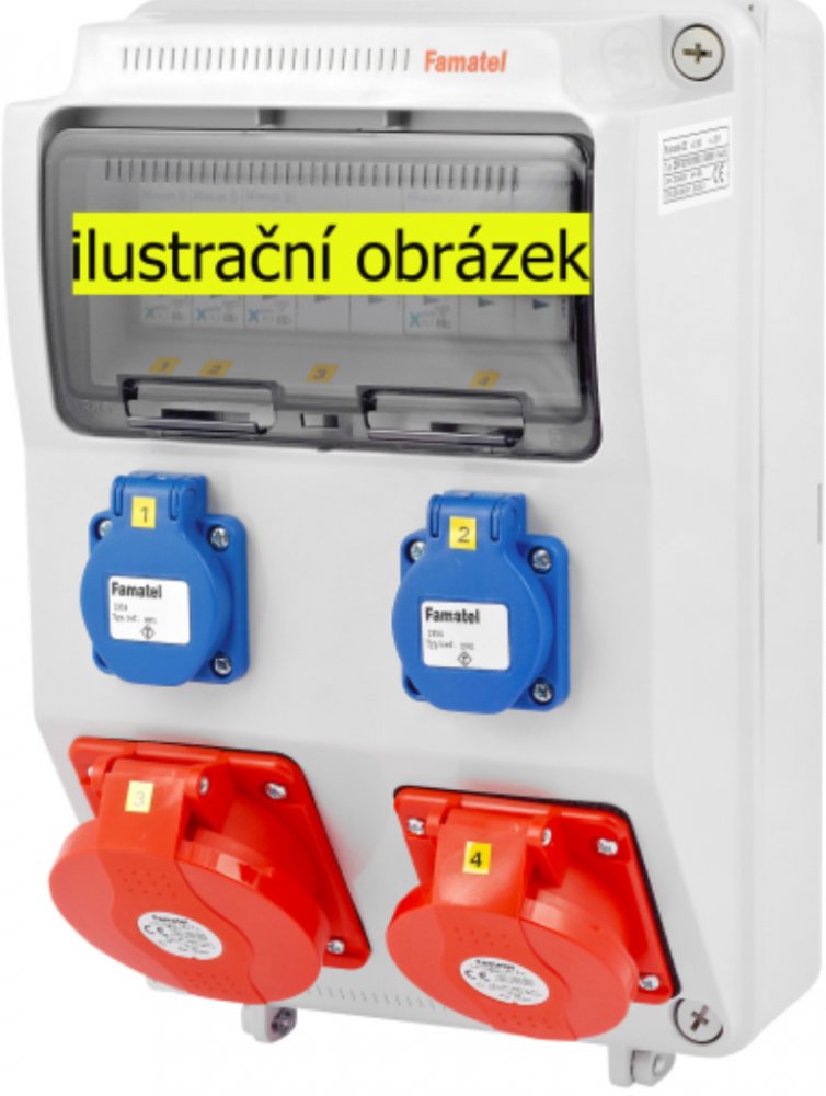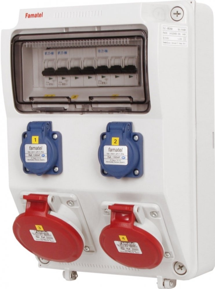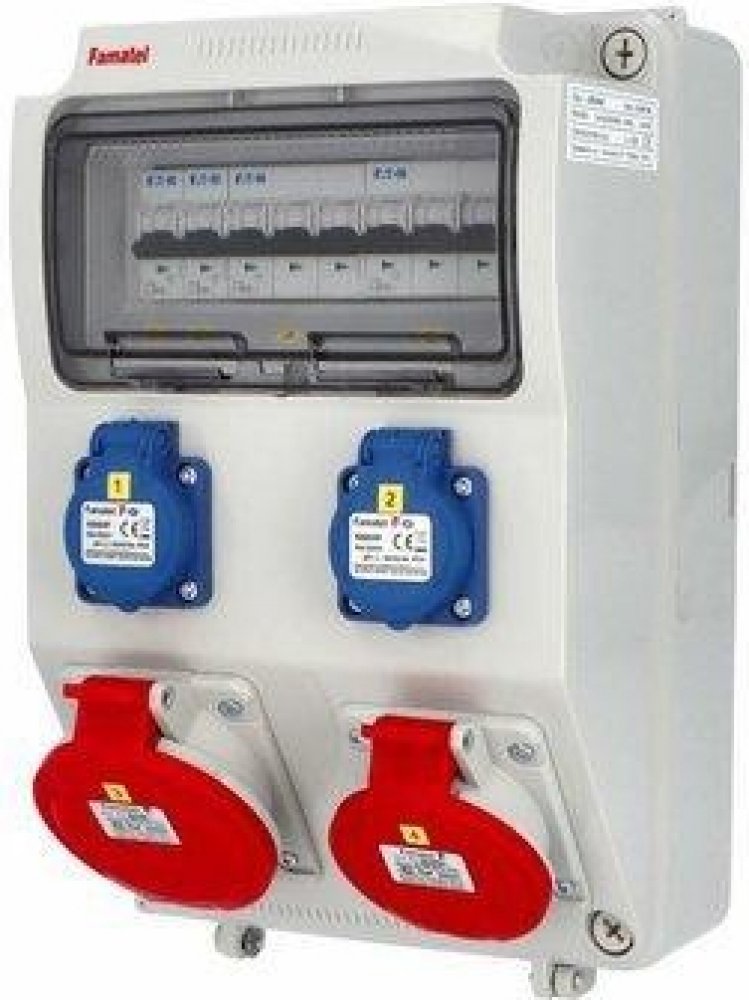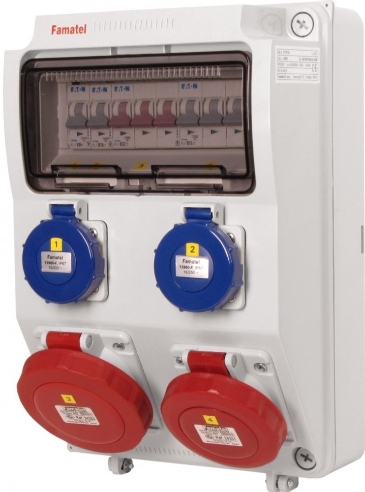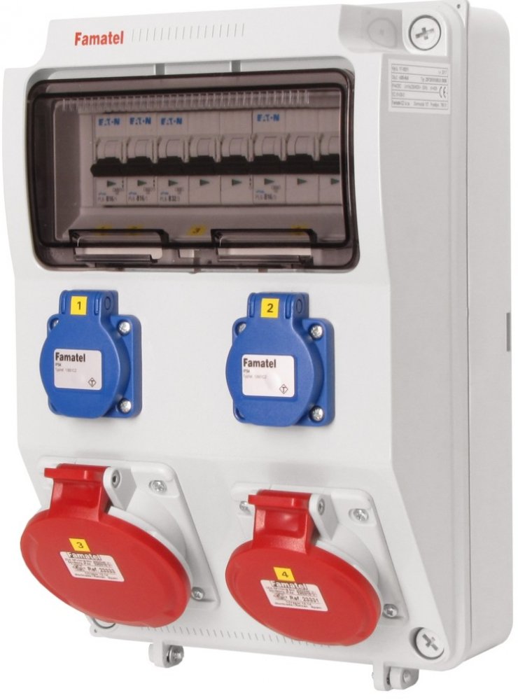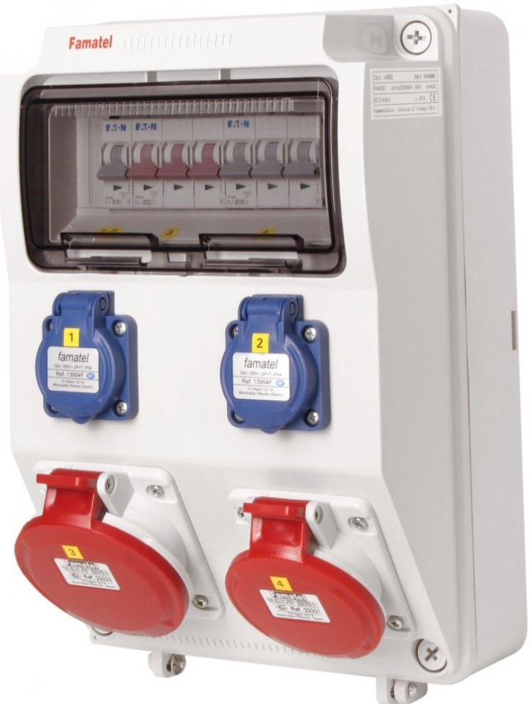 Zásuvková skříň FAMATEL v385-6kA-ZSF20101000.0 /3958 IP44 jištěná bez chrániče, zásuvky 2x230V, 1x16/5, 1x32/5, přístroje EATON 6kA: 2xPL6-B16/1, 1xPL6-B16/3, 1xPL6-B32/3, použité pouzdro: 3958 - 330x215x155mm, barva: světle šedá.