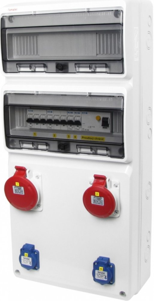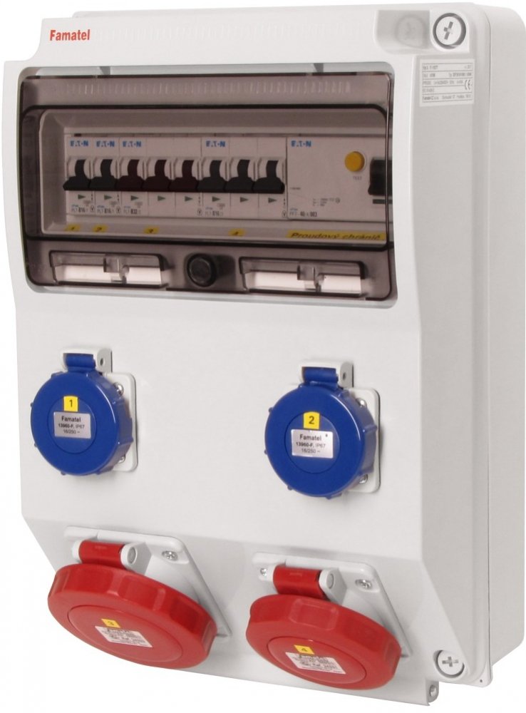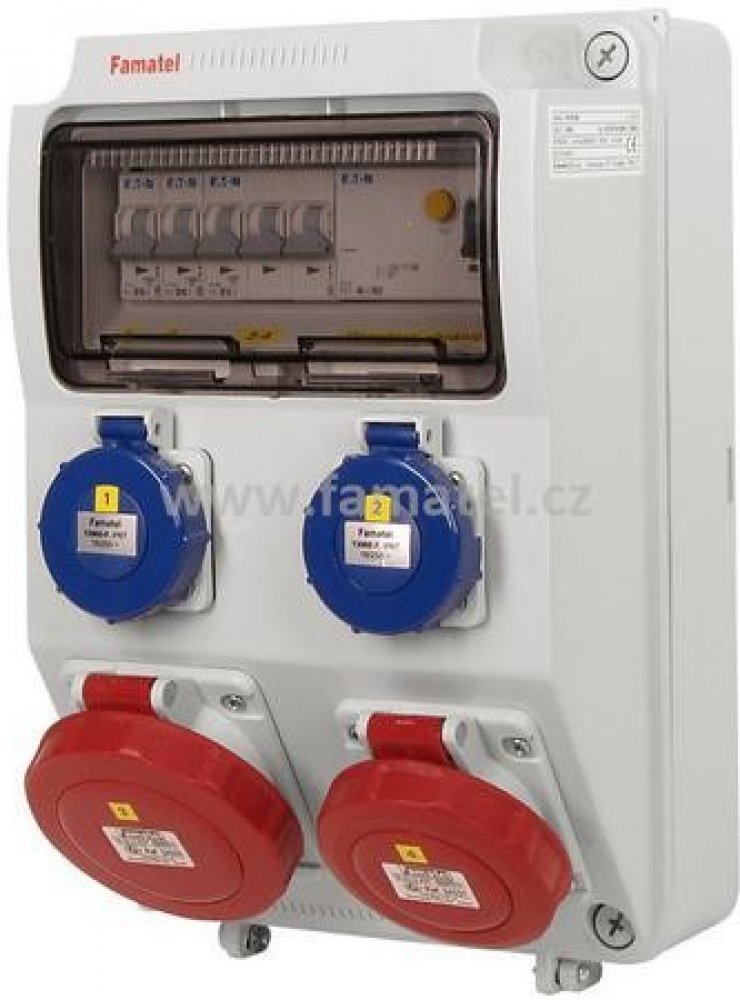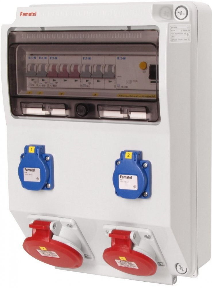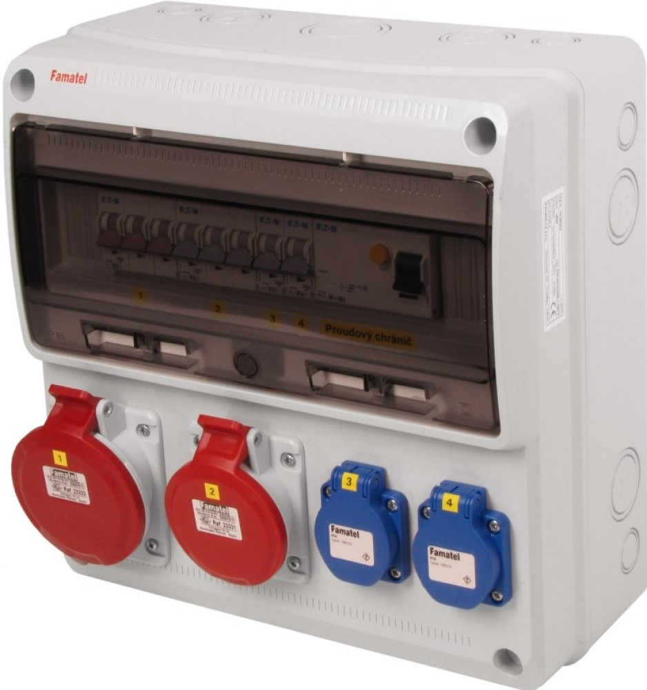 Zásuvková skříň FAMATEL v390-ZSF20101000.1 /3958 IP44 jištěná s chráničem 40/4/003 (ekonomická varianta), zásuvky 2x230V, 1x16/5, 1x32/5 přístroje EATON 10kA: 2xPL7-B16/1, 1xPL7-B16/3 (společný pro 3fáz. zásuvky), PF7-40/4/003 na vstupu, použité pouzdro: 3958 - 330x215x155mm, barva: světle šedá.