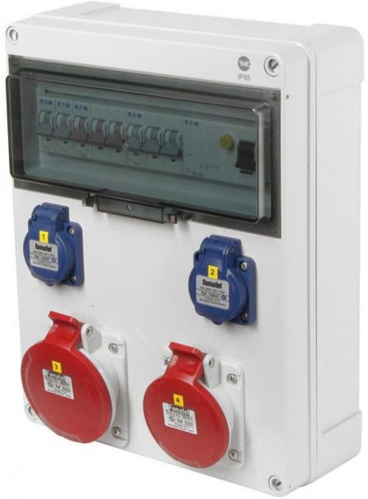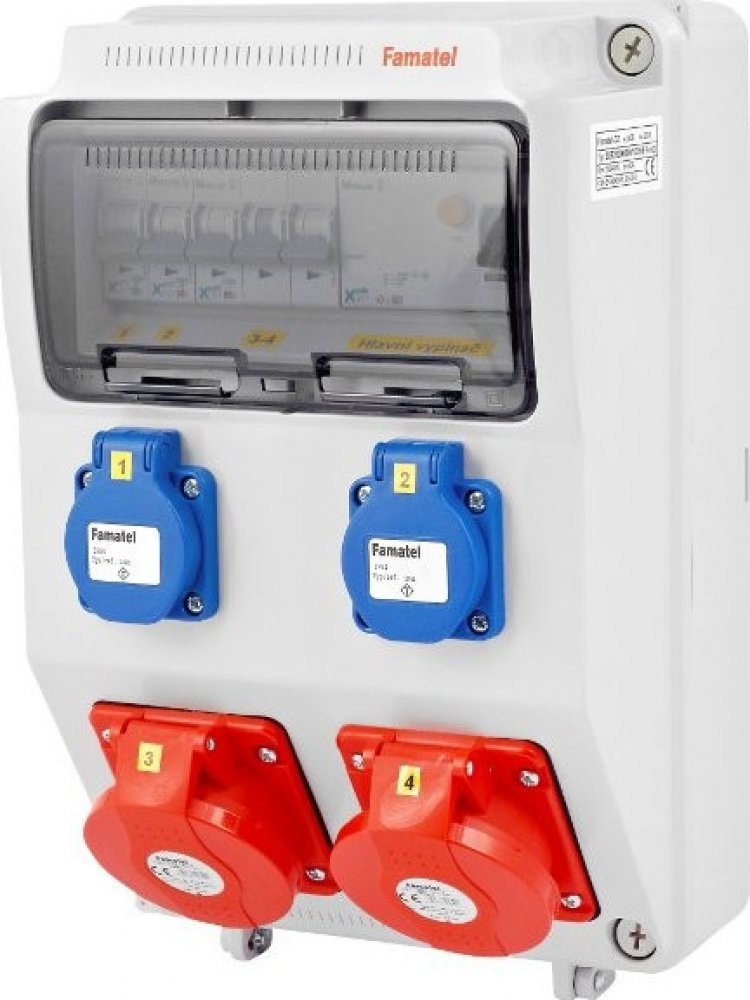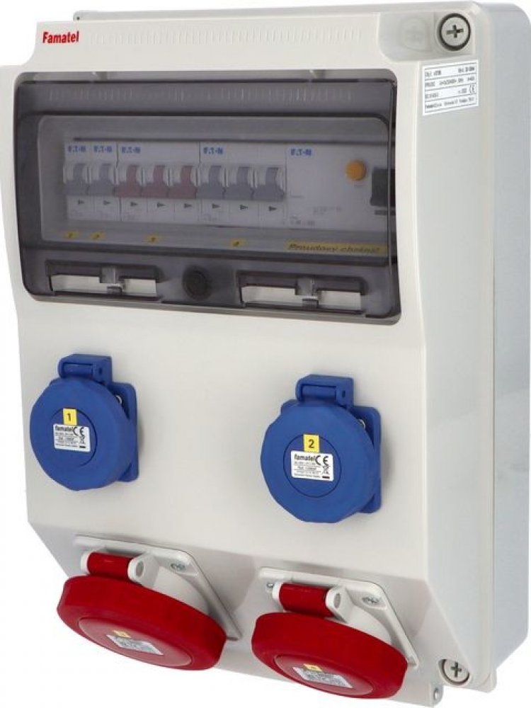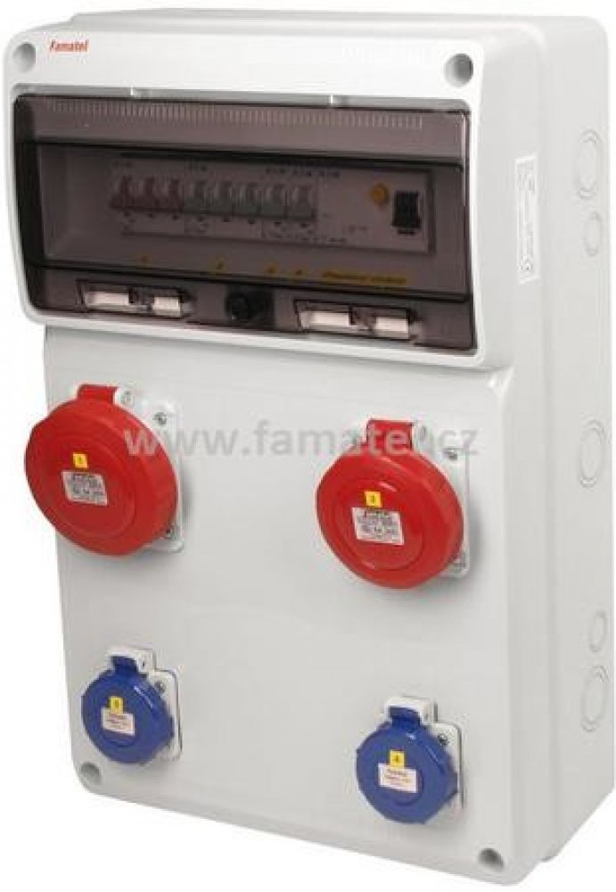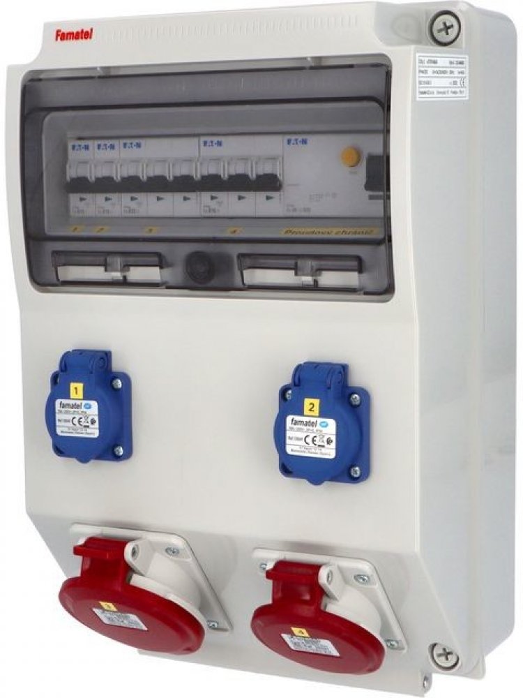 Zásuvková skříň FAMATEL v390-ZSF20101000.1 /3958 IP44 jištěná s chráničem 40/4/003 (ekonomická varianta), zásuvky 2x230V, 1x16/5, 1x32/5 přístroje EATON 10kA: 2xPL7-B16/1, 1xPL7-B16/3 (společný pro 3fáz. zásuvky), PF7-40/4/003 na vstupu, použité pouzdro: 3958 - 330x215x155mm, barva: světle šedá.