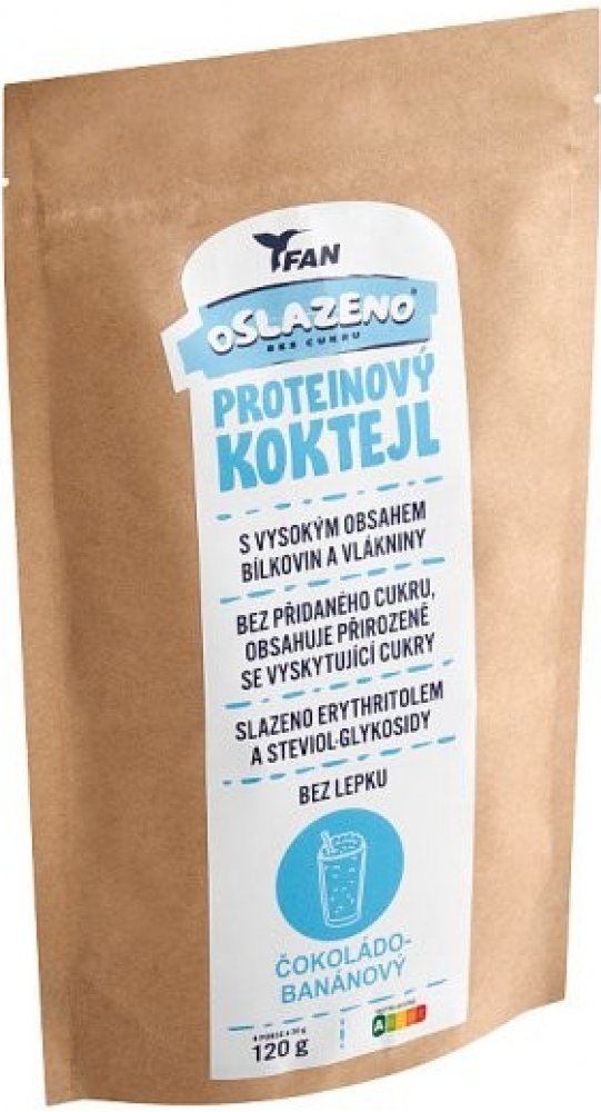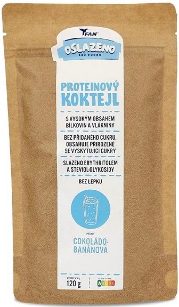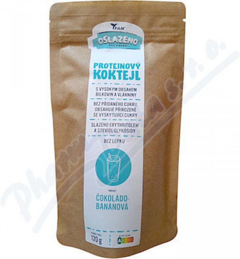 Sypká směs pro přípravu proteinového koktejlu, se sladidly. Baleno v uzavíratelném sáčku obsahujícím 4 porce - 4 × 30 g. Proteinové koktejly řady OSLAZENO bez cukru jsou novinkou na českém trhu. Nejen že obsahují vysoký podíl kvalitního syrovátkového proteinu, rozpustné vlákniny inulin, ale zároveň jsou doslazeny sladidlem přírodního původu - Erythritolem a Steviol-glykosidy. Klíčové vlastnosti proteinového drinku OSLAZENO BEZ CUKRU, čokobanánS vysokým obsahem bílkovin a vlákninyBez přidaného cukru, obsahuje přirozeně se vyskytující cukrySlazeno erythritolem a steviol-glykosidyBez lepku