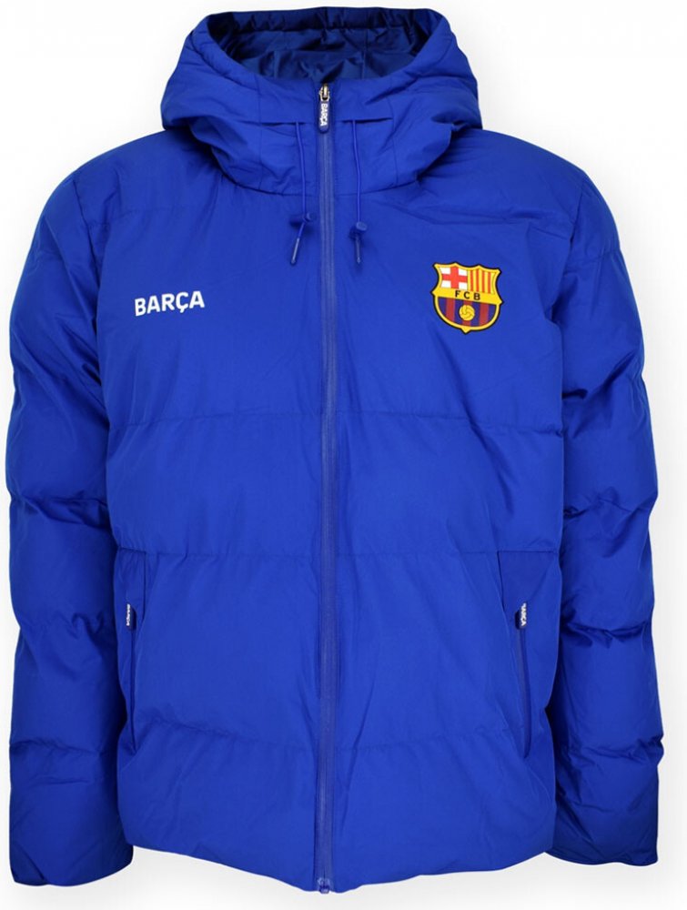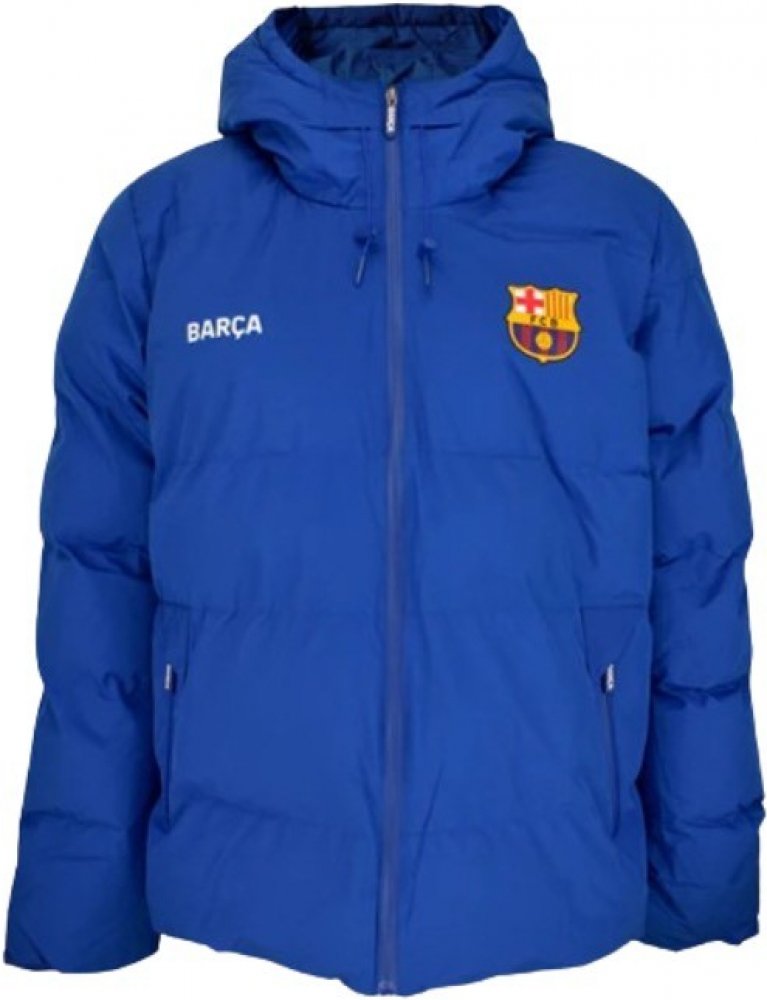 Zimní bunda FC Barcelona v modré barvě s logem na jedné straně hrudi a nápisem BARÇA na druhé straně.