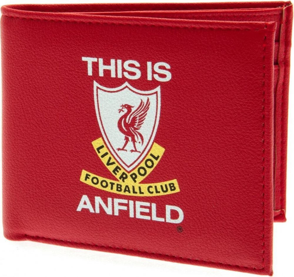 Peněženka Liverpool FC červené barvy s velkým retro znakem. 3 přihrádky na karty, okénko a 2 kapsy na bankovky. Kapsa na mince se zapínáním na cvoček. Rozměr: 11 a 9 cm (zavřená).
