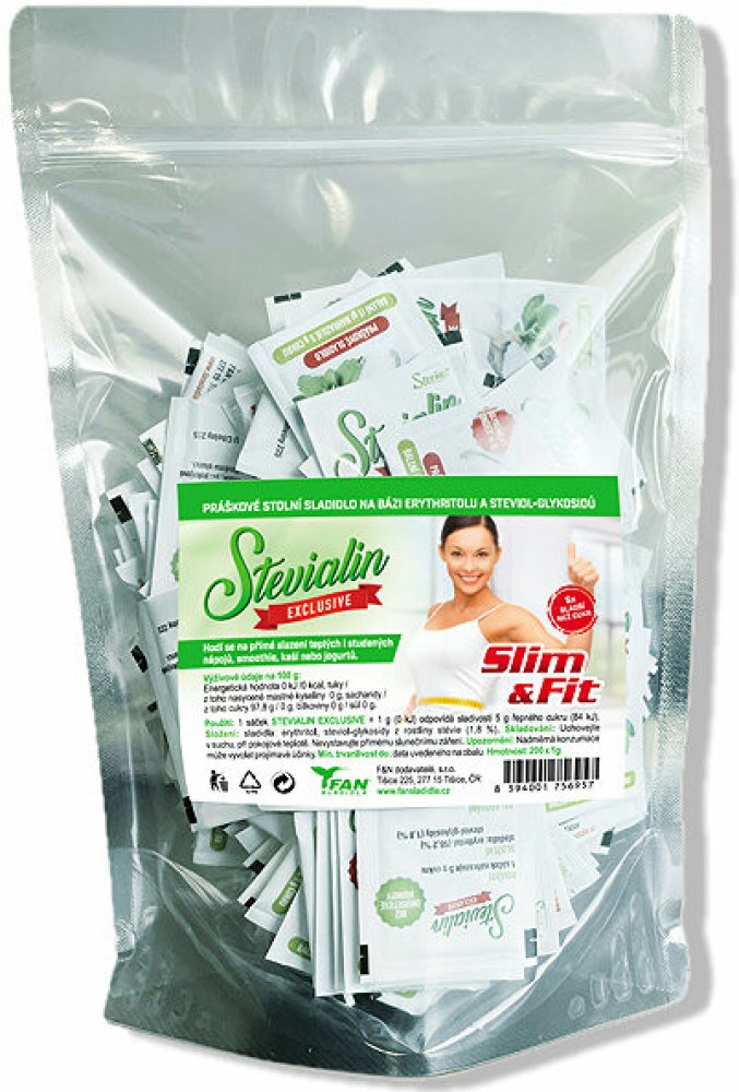 FAN Stevialin exclusive200× 1 g FAN Stevialin exclusiveNekalorické práškové sladilo se zvýšenou sladivostí (5x sladší než řepný cukr) na bázi erythritolu a steviol-glykosidů, dvou sladidel přírodního původu. Erythritol – polyalkohol získaný fermentací, velmi specifický druh sladidla, ač řazen mezi sacharidy, nepřepočítává se na výměnné jednotky, má 0 glykemický index. Steviol-glykosidy – sladidlo ...