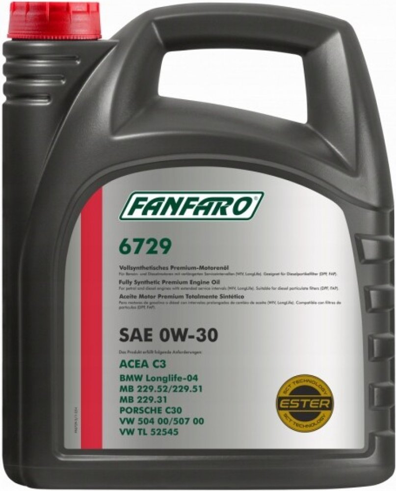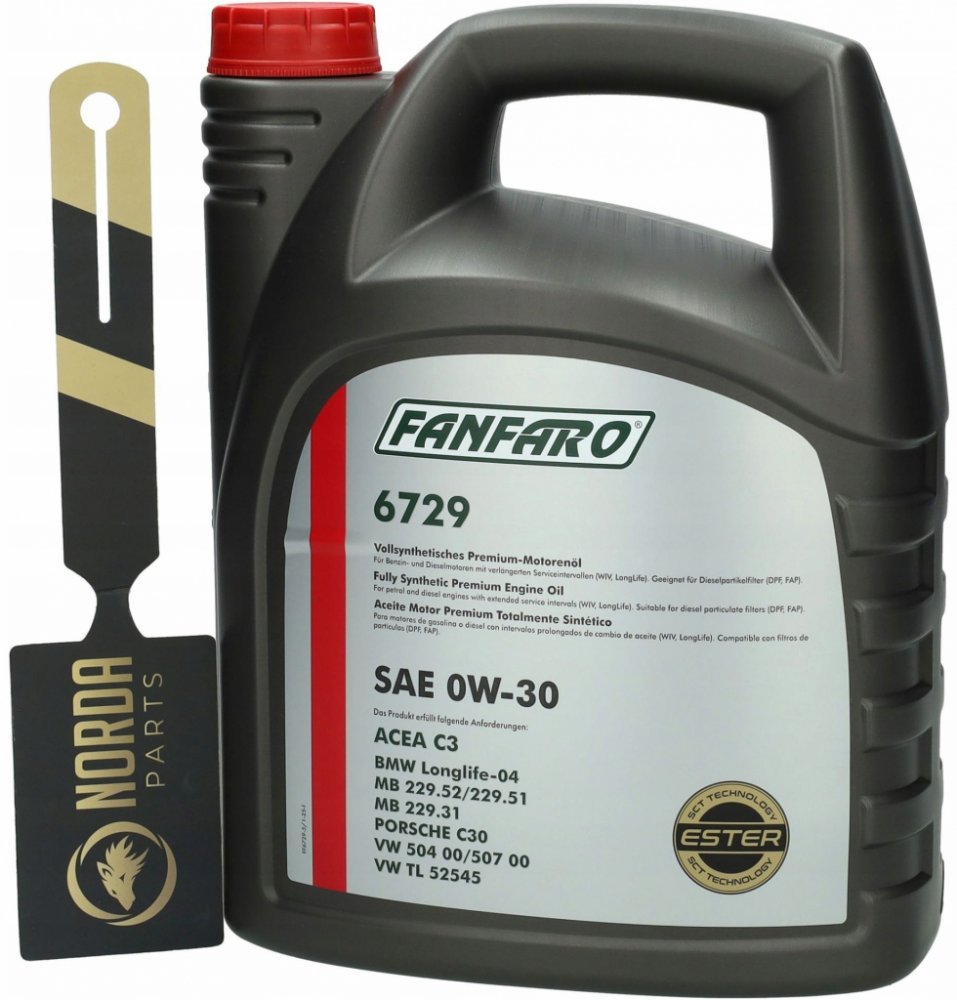 Vlastnosti: Díky bisyntetickému základu a speciálnímu balíčku přísad má vynikající vlastnosti proti zadření,proti opotřebení a tření, což zajišťuje dlouhý a bezproblémový provoz systému čerpadel vstřikovačů;- esterové složky oleje zajišťují výjimečnou odolnost olejového filmu,což v kombinaci s vynikající čerpatelností výrazně prodlužuje životnost motoru i za podmínek jízdy se systémem Start-Stop;- Díky vynikajícím dispergačním vlastnostem detergentů a nejvyšší termicko-oxidační stabilitě účinně bojuje proti všem druhům usazenin a udržuje části motoru čisté po celou dobu výměny;- Šetří palivo díky optimálním protitřecím vlastnostem a snížené viskozitě při vysoké teplotě při vysoké rychlosti smyku HTHS;- Nízká viskozita, bisyntetická báze (PAO+estery) a balíček vysoce výkonných přísad zajišťují mimořádně snadné startování motoru při nízkých teplotách díky bezkonkurenční manévrovatelnosti a čerpatelnosti,což výrazně snižuje opotřebení motoru při startování;Optimální viskozita v širokém rozsahu teplot zaručuje stabilní provoz ve všech provozních režimech,včetně přetížení;Vysoká termicko-oxidační stabilita účinně zabraňuje stárnutí; Kompatibilní se všemi systémy neutralizace výfukových plynů,DPF, TWC, EGR a SCR díky použití technologie Mid SAPS;Používá se v motorech s prodlouženou dobou výměny oleje (Long Life až 30 000 km) a konvenčních;Vhodné pro motory poháněné zkapalněným zemním plynem (LNG) a zemním plynem (LPG). Určeno pro benzínové a naftové motory splňující normu EURO V a EURO VI v široké škále osobních automobilů (auta, lehké SUV, minibusy a lehké nákladní automobily) evropských a dalších výrobců. Doporučeno pro použití v motorech automobilů Daimler, BMW a VW, které mají dodatečné požadavky na motorové oleje (podle výše uvedené specifikace). Olej není vhodný pro použití v nákladních automobilech a podobných vozidlech!