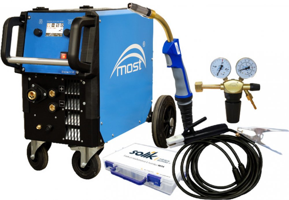 Set obsahuje kromě svářečky Fanmig 212 LCD MOST také: Svařovací hořák CO2-MIG/MAG MOST M24 SGRIP 4 m Startovací sada na MIG/MAG (CO2) hořák M24 v kufříku Redukční ventil Argón/CO2 Brass MOST Plus DIN N2 Svařovací poloautomatický invertor FANMIG 212 LCD je napájen z jednofázové sítě 230 V. Součástí zařízení je filtr PFC (Power Factor Correction) - výhodou invertoru se zabudovaným PFC je vyšší energetická účinnost, nižší zatížení elektrické sítě (slabší pojistka), větší tolerance vůči kolísání a menší rušení generované zařízením. Další informace o funkcích a výhodách svářečky najdete v samostatné recenzi na našem blogu. 4-kladkový podavač drátu umožňuje svařování drátem z cívek 15 kg/K300. Doporučené průměry ocelových drátů jsou 0,8 mm a 1,0 mm, pro hliník 1,0 mm. Po změně polarity lze použít i drát s vlastním stíněním (trubičkové dráty) 0,8 nebo 0,9 mm. FANMIG 212 LCD je kompaktní zařízení, tzn. zdroj energie a podavač drátu jsou pod jedním krytem. Na zadní polici lze umístit plynovou láhev o maximální výšce 120 cm. Svářečka je určena pro lehké renovační práce, opravy karoserií, řemeslnou výrobu, výrobu lehkých ocelových konstrukcí a pro hobby použití. Ovládací panel svářečky Fanmig 212 LCD a programy pro synergické svařování Ovládací panel je vybaven barevným LCD displejem. Parametry se nastavují pomocí dvou knoflíků, které slouží k výběru a akceptování jednotlivých funkcí a jejich hodnot. Svářečka Fanmig 212 LCD disponuje programy pro synergické svařování MIG/MAG, obalenou elektrodou MMA a TIG DC. Nabízí řadu programů pro svařování oceli, nerezu a hliníku. K dispozici je také program pro tvrdé pájení s drátem CuSi3 Ø 0,8 mm nebo 1,0 mm. Dráty CuSi se používají ke spojování pozinkovaných plechů. při opravách karoserií, program CuSi 1,0 mm je nejlepším řešením pro takovou aplikaci. Většina zařízení na trhu nemá programy CuSi, ani fyzickou schopnost svařovat pozinkované plechy bez poškození ochranného nátěru. Nechybí ani funkce jako předfuk, dofuk, dohoření, tlumivka, režim 2-TAKT/4-TAKT atp. Svářečka Fanmig 212 LCD disponuje programy pro synergické MIG/MAG svařování v polohách PA (shora dolů) a PB (vodorovná šikmo shora), manuální MIG/MAG svařování, pro svařování obalenou elektrodou MMA a TIG Lift: Synergie - podle nastavených parametrů v synergii se mění a zobrazuje tvar svaru (v tomto příkladu je zvolen program 02, koutový svar PB, režim 2T, svařovací proud 100 A, korekce napětí minus 4,0 V. To odpovídá parametrům svařování pro ocelové plechy tloušťky cca 2 mm: V programech lze zvolit svařovaný materiál, druh a tloušťku drátu, ochranný plyn – následně na displeji nastavíme tloušťku svařovaného materiálu. Svářečka nabízí řadu programů pro všechny základní kombinace: pro materiály jako ocel, nerez, hliník, i pro trubičkový drát či pájení:
