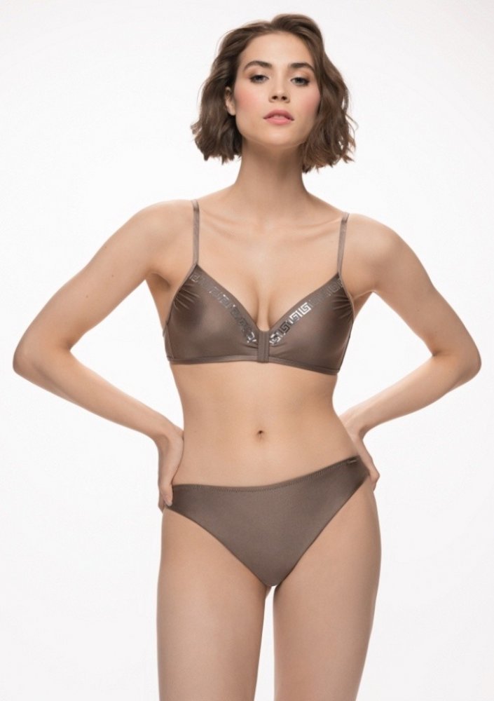 Dámské plavky české značky Fantasy. Plavky se prodávají jako komplet - podprsenka a kalhotky. Podprsenka je bezkosticová, košíčky jsou jemně vyztužené, které Vám vytvarují hezké poprsí. Košíčky jsou na bocích nařasené a kolem obvodu košíčků je natištěná stříbrná ozdoba. Podprsenka má boční kostice, aby dobře držela tvar okolo obvodu. Vzadu se podprsenka uvazuje širšími šňůrkami. Ramínka jsou tenká a délkově nastavitelná, vzadu se dají odepnout a lze je uvázat za krk. Kalhotky jsou brazilkového střihu, vpředu jsou hladké a vzadu jsou v horní části uprostřed nařasené. Materiálové složení: 80% polyamid, 20% elastan