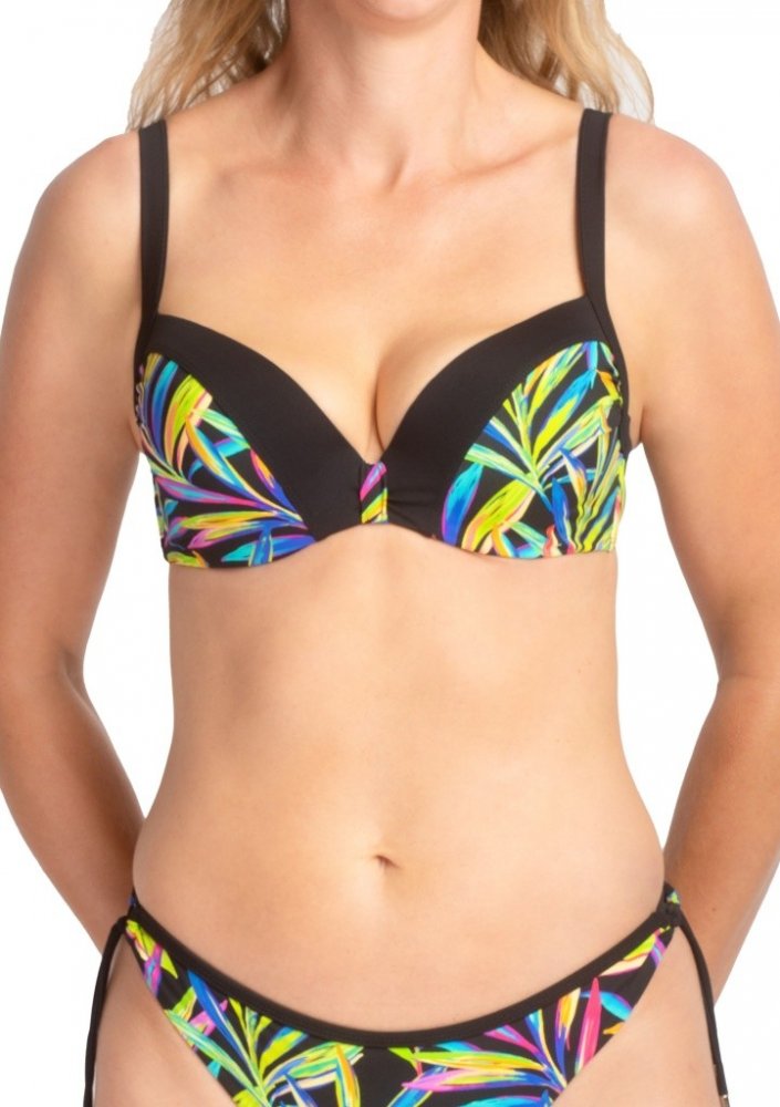 Dámske plavky FANTASY - horní díl. Plavková podprsenka s mírným push up efektem má vyztužené košíčky s kosticemi a nižší střed. Na bocích jsou košíčky lehce nařaseny, z vnější strany jsou košíčky lemovány černou látkou a mezi košíčky je ozdobný látkový proužek. Vpředu jsou ramínka pevně všitá, vzadu na háček - dají se tak nosit i překříženě. Pružný obvod je v bocích vyztužen flexibilní silikonovou kosticí, aby podprsenka držela na místě. Zapínání na zádech je řešeno kovovou sponou. Celé plavky jsou podšity. Horní a spodní díl z jedné kolekce lze libovlně kombinovat.