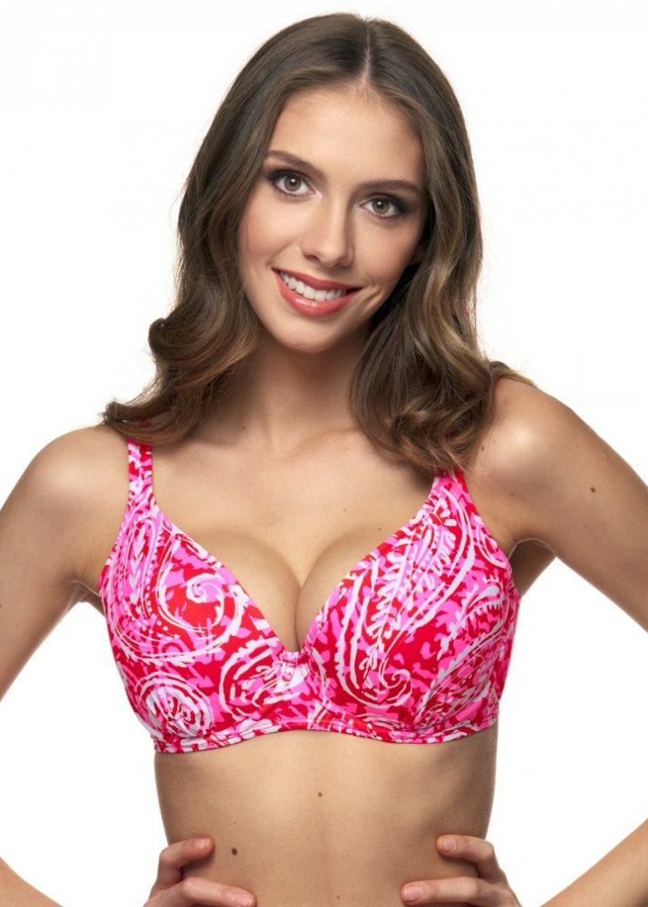 Dámské plavky Fantasy z nové kolekce Samanta. Dámský horní plavkový díl s elegantním barevným vzorem má jemně vyztužené nařasené košíčky s kosticemi a nižší střed. Plavky lemuje úzký proužek ve stejné barvě jako je podprsenka. Střih košíčků a středně široký obvod podprsenky s bočními pružnými kosticemi Vám zaručí pevné a pohodlné nošení. Podprsenka má nastavitelná ramínka, která lze jednoduše zapn...