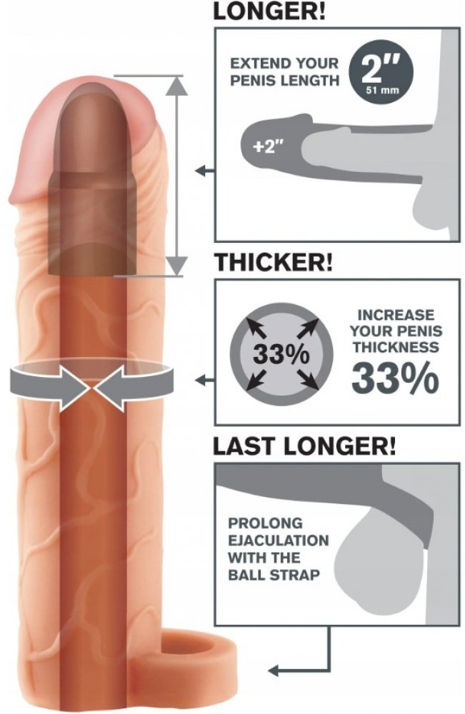 Zintenzivněte rozkoš pro vás oba s The Perfect 2″ Extension s Ball Strap. S řemínkem na koule, který vás těsně obepíná, prodloužíte ejakulaci pro nejvýbušnější vyvrcholení, jaké jste si kdy představovali. Vaše partnerka si díky 2″ prodloužení na špičce užije hlubší průnik, zatímco díky ultra-živému dříku budete o 33 % silnější a nabídnete tak plnější pocit a výjimečné vyvrcholení. Je super elastický, aby se přizpůsobil většině velikostí, je dostatečně těsný, aby vám pomohl vydržet déle, a super jemný materiál Fanta Flesh působí jako druhá kůže - jen lépe!