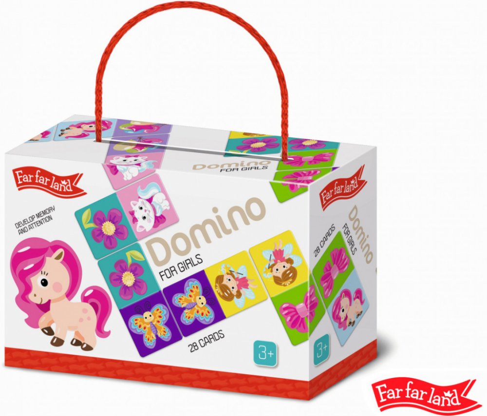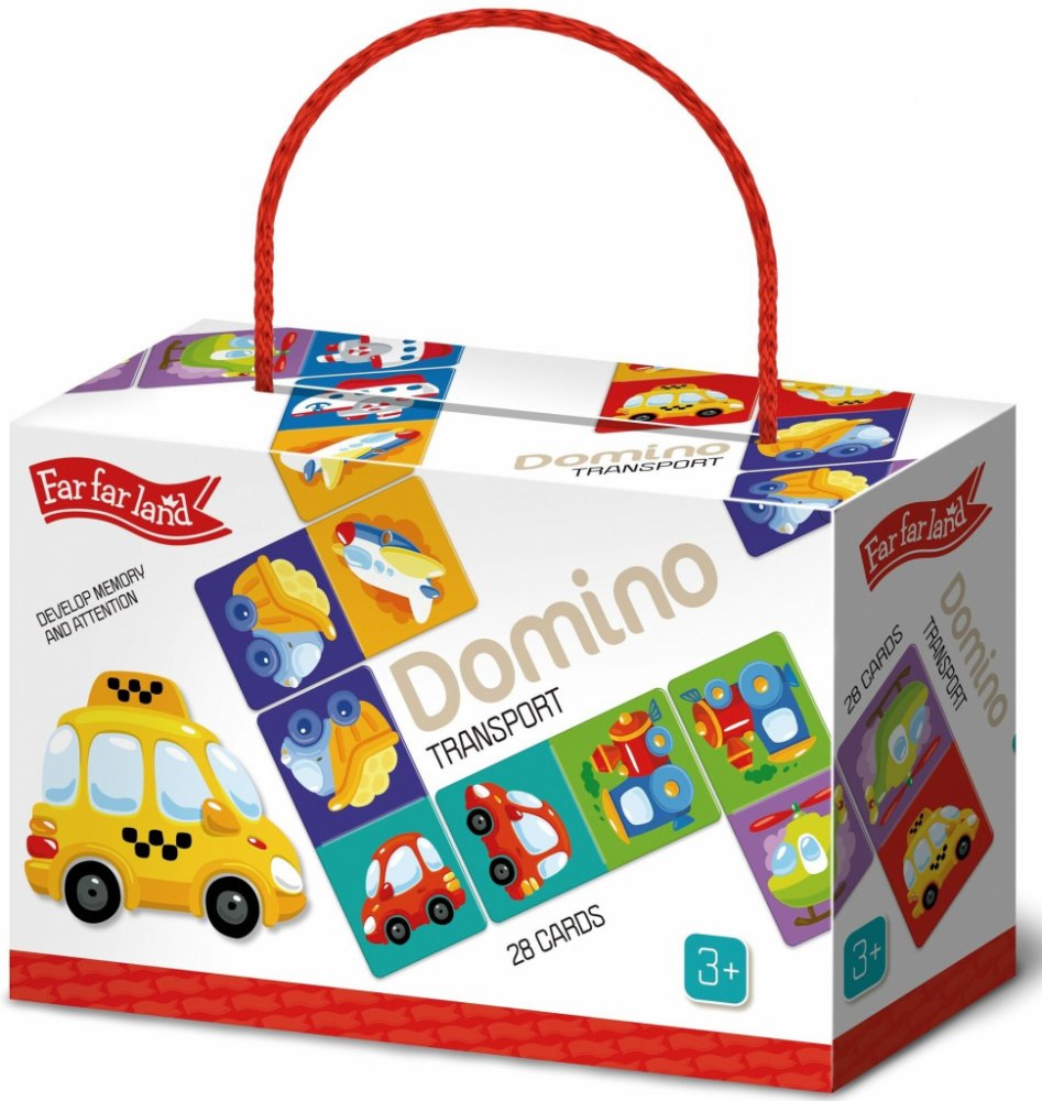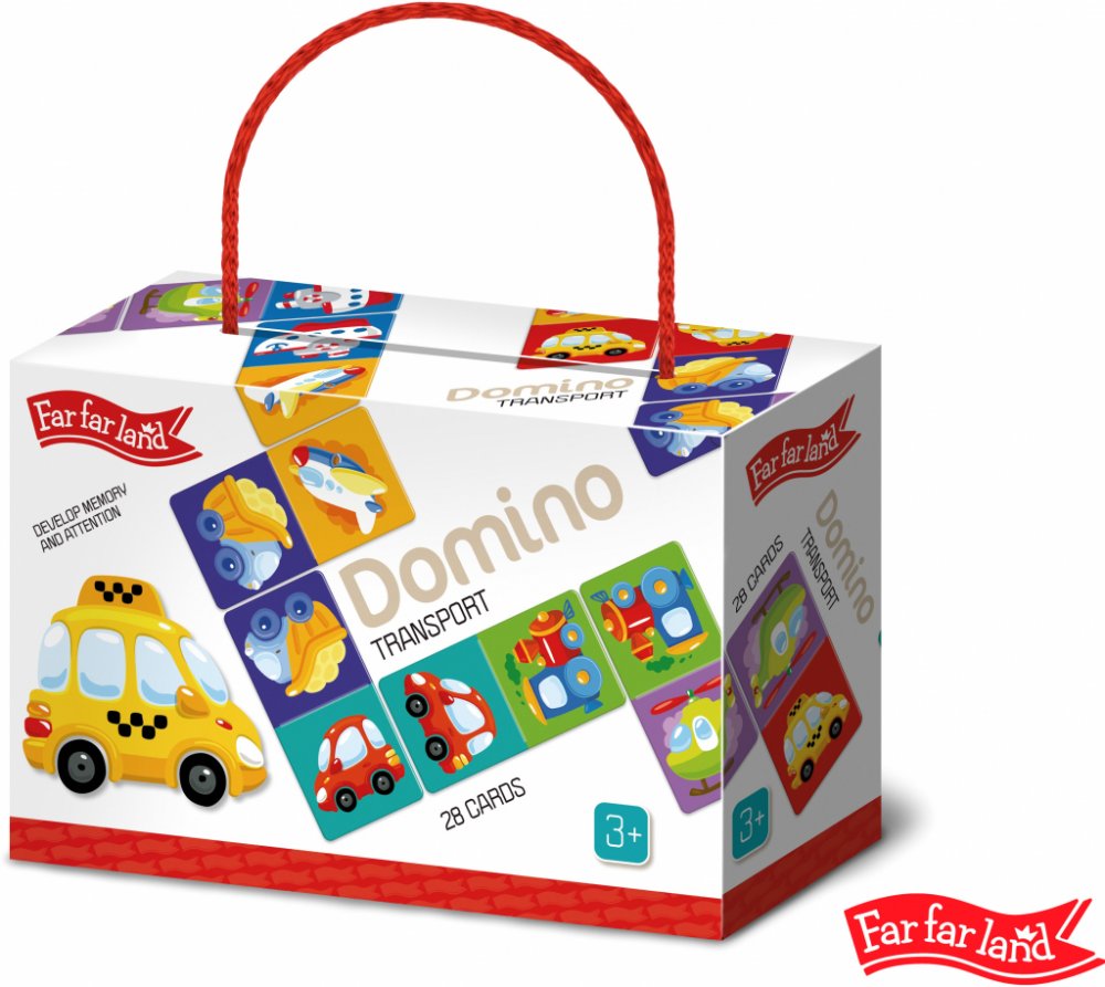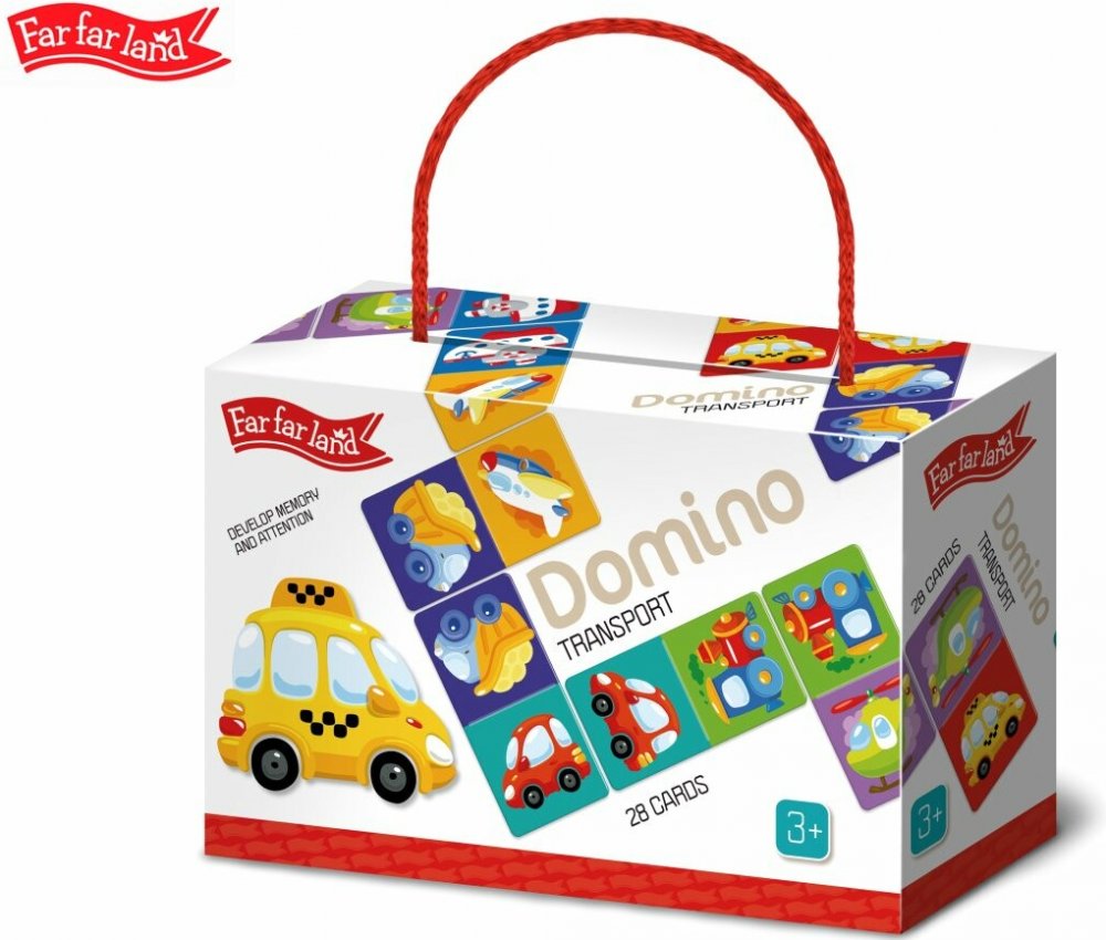 Far Far Land Domino s obrázky doprava. Balení obsahuje 28 karet. Hra pro 2-5 hráčů. Při hře 2 hráčů každý hráč dostane 7 karet. Při hře více hráčů každý dostane 5 karet. Zbývající karty jsou v "banku.“ Hráč, který má "dvojitou" kartu (kartu s totožnými obrázky), hraje první. Pokud žádný z hráčů nemá dvojitou kartu, každý hráč si vezme jednu kartu z banku. Pokud má více hráčů dvojitou kartu, začíná ten mladší. Pro rozehrání prvního tahu si však můžete vymyslet svá vlastní pravidla. Hráči se střídají a jeden za druhým přikládají karty ze své ruky ke kartám na hrací ploše se shodným obrázkem. Pokud hráč nemá shodný obrázek, musí si vzít kartu z banku. Hráč, který položí svou poslední kartu na hrací plochu, vyhrává. Pokud všichni hráči mají v ruce karty, ale není možné hrát dál, hra je ukončena "blokem" a vyhrává hráč, který má v ruce nejmenší množství karet.