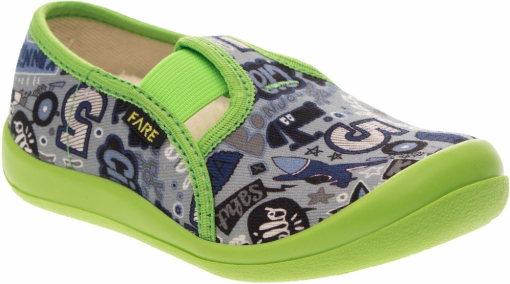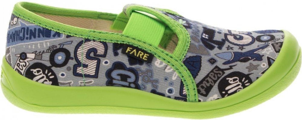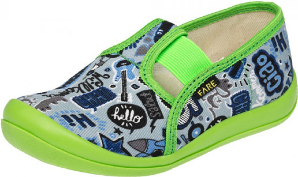 Přezůvková, nízká, textilní, lemovaná obuv, pruženkové uzavírání. Materiál svršku je z barevného pracího kordu, vnitřek je z bavlněného kepru. Podešev je vyvinuta jako odlehčená, materiál podešve z termoplastického elastomeru, je neklouzavá pro všechny běžně používané podlahoviny. Tato domácí a přezůvková obuv odpovídá ortopedickým požadavkům a zásadám zdravého obouvání. Obuv je v prstové části pr...