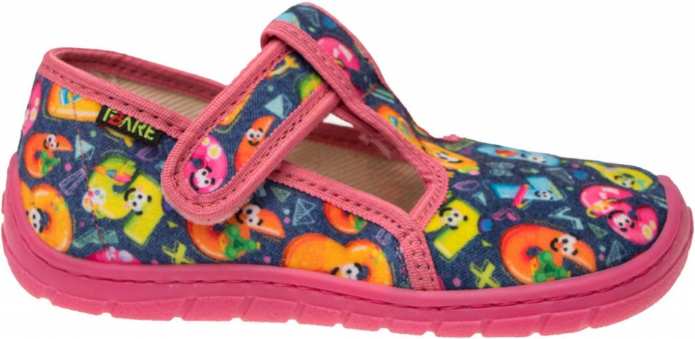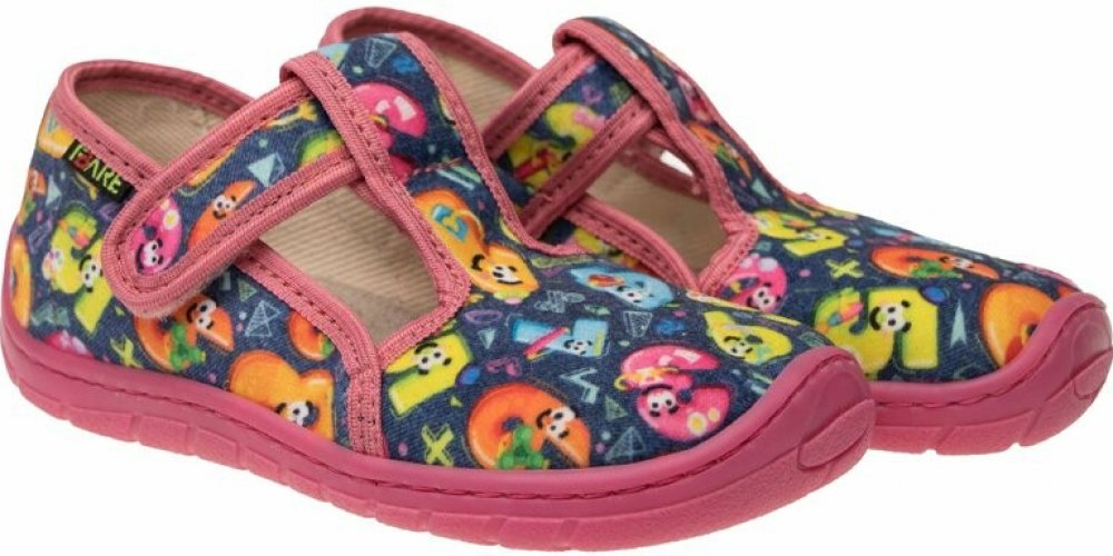 Dětská domácí/přezůvková štróblovaná obuv na suchý zip. Našívací (štróblovaná) stélka umožňuje lepší ohyb boty. Vrchový materiál: textil. Podešev je vyrobena z termokaučuku, který je velmi flexibilní příčně, ale i podélně.Modely typové řady FARE BARE se odlišují od běžné klasické produkce především výrazně větším prostorem v prstové části. Mají ambici neomezovat vývoj nohy zejména v přední části chodidla, kde poskytují mnohem větší prostor. Vynikají také svojí lehkostí a vysokou flexibilitou.Tyto modely FARE BARE jsou vybaveny dvěma vkládacími stélkami. Horní stélka je funkčně i vzhledově obdobou klasického provedení. Druhá - spodní stélka má za úkol umožnit uživateli doregulovat si potřebný prostor uvnitř obuvi. Velmi snadno se v případě potřeby odstraní nebo naopak doplní o další vrstvu. Odstraněním jedné vrstvy stélek je možné prostor zvětšit.Více informací o tom, jak zvolit správnou velikost se dozvíte ZDE.