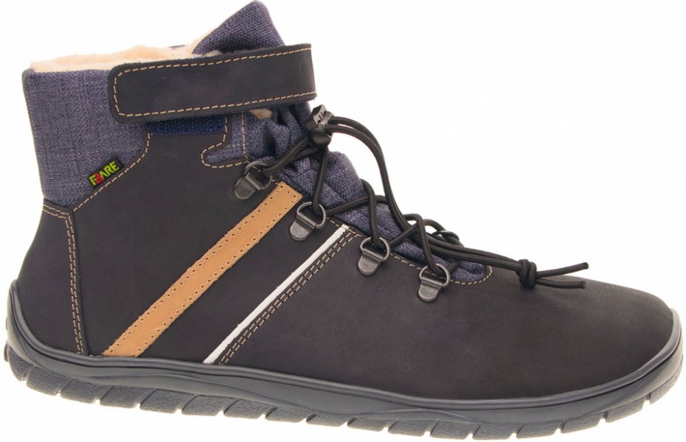 Zimní štróblovaná kotníková obuv s membránou, se zapínáním na suchý zip v kombinaci s gumolankem. Našívací (štróblovaná) stélka umožňuje lepší flexibilitu boty. Vrchový materiál: přírodní hovězinová useň broušená (nubuk) v kombinaci s textilem. Podšívka je zimní s hřejivým, středně dlouhým vlasem, stélka je vyrobena z vlny MERINO. Podešev je vyrobena z termokaučuku, jehož složení splňuje parametry pro používání v zimním období. Důležitou předností tohoto modelu je nepropustnost vůči vodě, jelikož je vybaven velmi kvalitní a osvědčenou klima membránou, která nedovolí prostup vody dovnitř, zároveň však umožňuje odvod tělesných par směrem ven z obuvi. Modely typové řady FARE BARE se odlišují od běžné klasické produkce především výrazně větším prostorem v prstové části. Mají ambici neomezovat vývoj nohy zejména v přední části chodidla, kde poskytují mnohem větší prostor. Vynikají také svojí lehkostí a vysokou flexibilitou. Tyto modely FARE BARE jsou vybaveny dvěma vkládacími stélkami. Horní stélka je funkčně i vzhledově obdobou klasického provedení. Druhá, spodní stélka má za úkol umožnit uživateli doregulovat si potřebný prostor uvnitř obuvi. Velmi snadno se v případě potřeby odstraní nebo naopak doplní o další vrstvu. Odstraněním jedné vrstvy stélek je možné prostor zvětšit. Oproti klasické pevné obuvi není možné u těchto konstrukcí očekávat stejnou stabilitu, odolnost, tepelně izolační vlastnosti, či pevnost opatku.Nejste si jisti výběrem velikosti? Více informací se dozvíte ZDE.