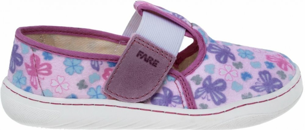 Dětská domácí/přezůvková štróblovaná obuv se zapínáním na suchý zip v kombinaci s gumičkou. Našívací (štróblovaná) stélka umožňuje lepší ohyb boty. Vrchový materiál: textil s potiskem motýlků a kytiček, které se zalíbí každé malé slečně. Jedná se o model z kolekce FARE WIDE, která konstrukčně vychází z řady klasické obuvi FARE, ale poskytuje výrazně větší prostor v oblasti prstů a je osazena vysoce flexibilní podešví, která je ohebná ve všech směrech. Vnitřní stélka obuvi FARE WIDE je vybavena podporou v oblasti klenby a je vyjímatelná. V oblasti opatku je použito mírné vyztužení, obuv má však nulový drop (rozdíl ve výšce mezi patou a špičkou boty). Obuv FARE WIDE je vyhovující i pro vyznavače barefoot obouvání, v případě potřeby je možno tvarovanou stélku vyměnit za stélku rovnou. Součástí výrobku jsou tzv. regulační stélky, kterými lze doregulovat vnitřní prostor v botě."