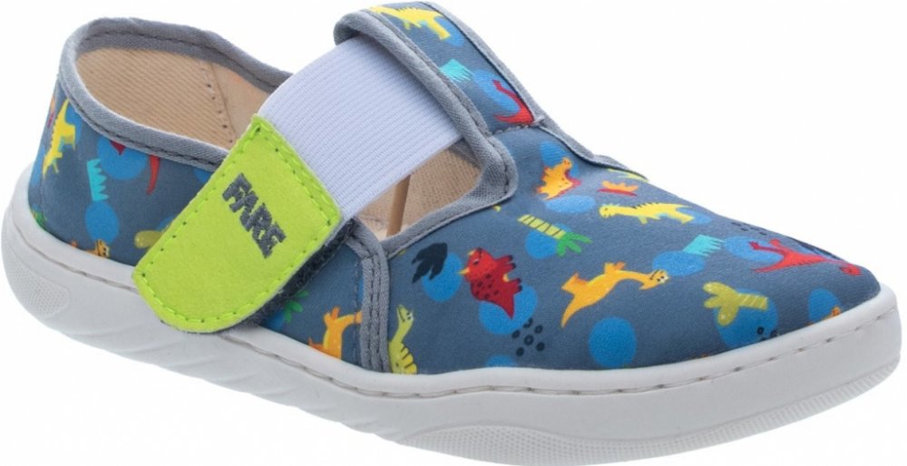 Dětské bačkůrky s dinosaury Fare Mid-Wide 7001461 jsou navrženy tak, aby poskytovaly maximální pohodlí a přirozený pocit při chůzi, ideální zejména pro vyznavače barefoot obouvání. Díky vyjímatelné stélce s podporou klenby, kterou lze snadno vyměnit za rovnou stélku (součást balení), umožňují přizpůsobení boty podle potřeby. Tyto bačkory nabízejí výrazně větší prostor v oblasti prstů, což ocení děti se širší nohou. Střih je vhodný pro typické potřeby středního i vyššího nártu a průměrného kotníku a paty, avšak nejsou určeny pro užší chodidla. Flexibilní podešev o tloušťce 3–4 mm je ohebná ve všech směrech, což podporuje přirozený pohyb nohy. Opatek je mírně vyztužen pro lepší stabilitu a přezůvky se jednoduše zapínají na suchý zip. Textilní bačkůrky se syntetickou podešví a zapínáním na suchý zip v kombinaci s gumičkou.