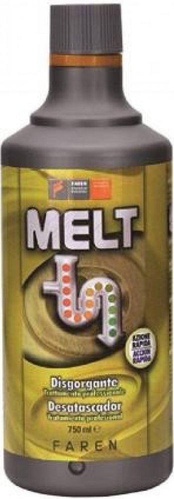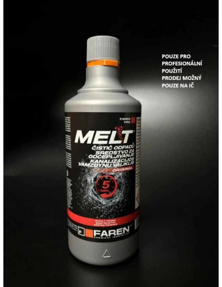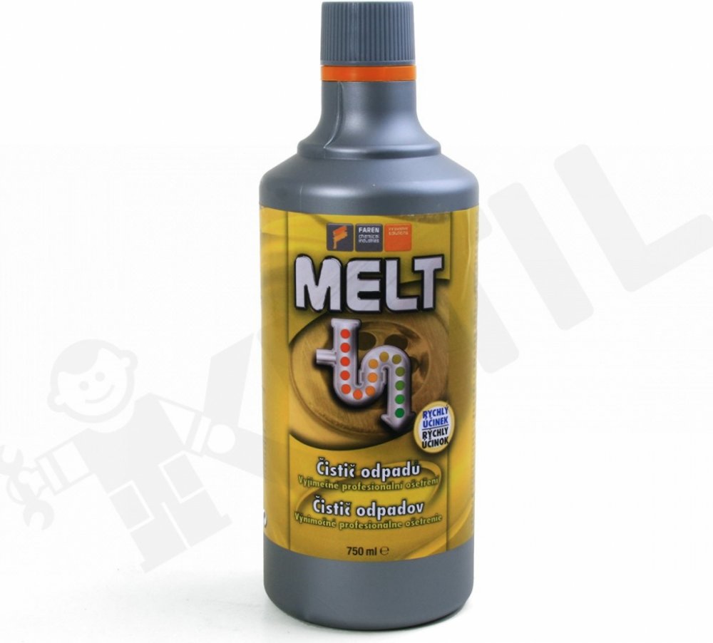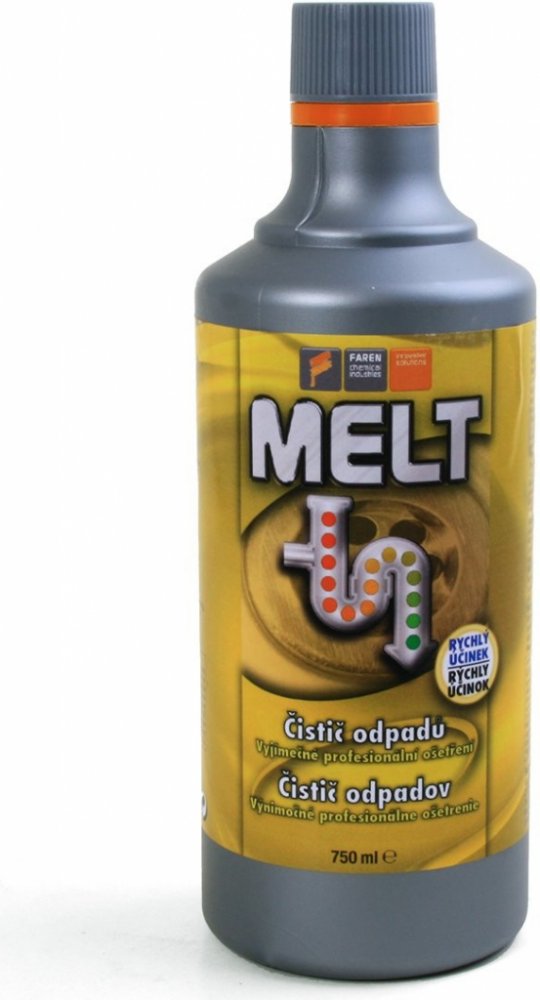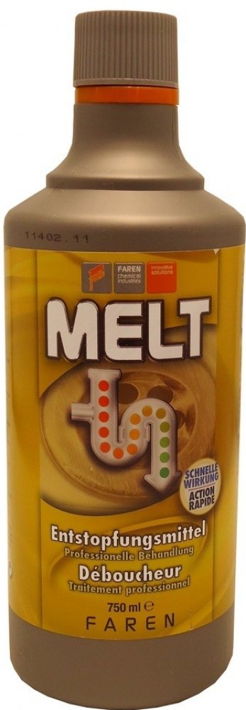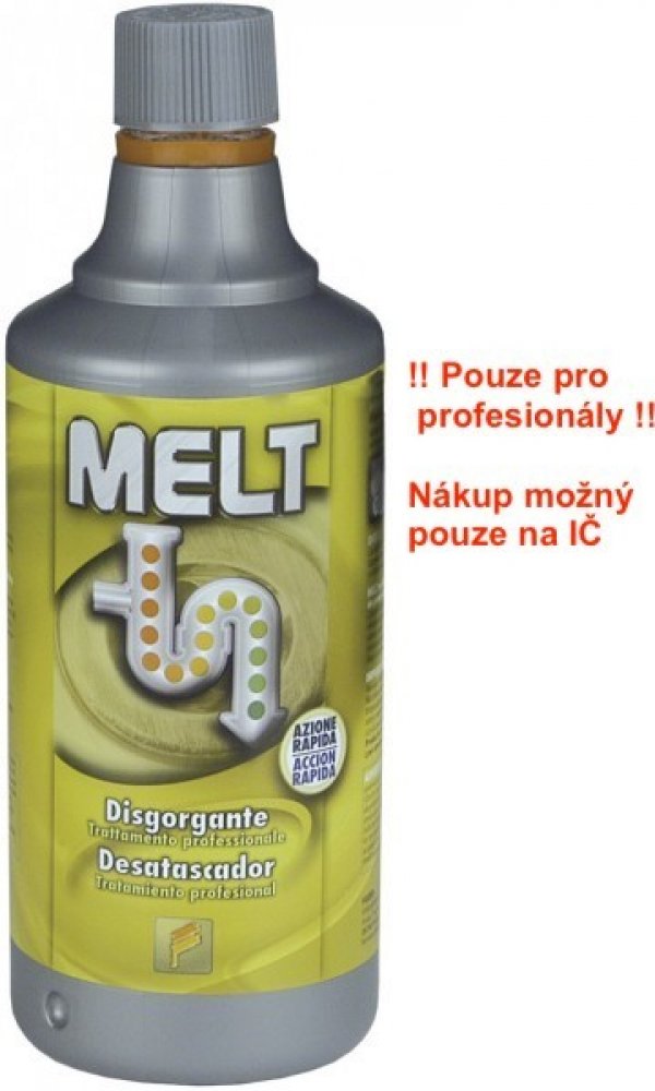 MELT je výrobek s vysokou koncentrací kyseliny sírové a inhibitorů koroze, který v několika málo minutách uvolní ucpávky způsobené odolnými nánosy tuků, bílkovin, škrobů, vlasů, celulózy vápna, vodního a močového kamene, papíru, hygienických pomůcek, listí, apod.