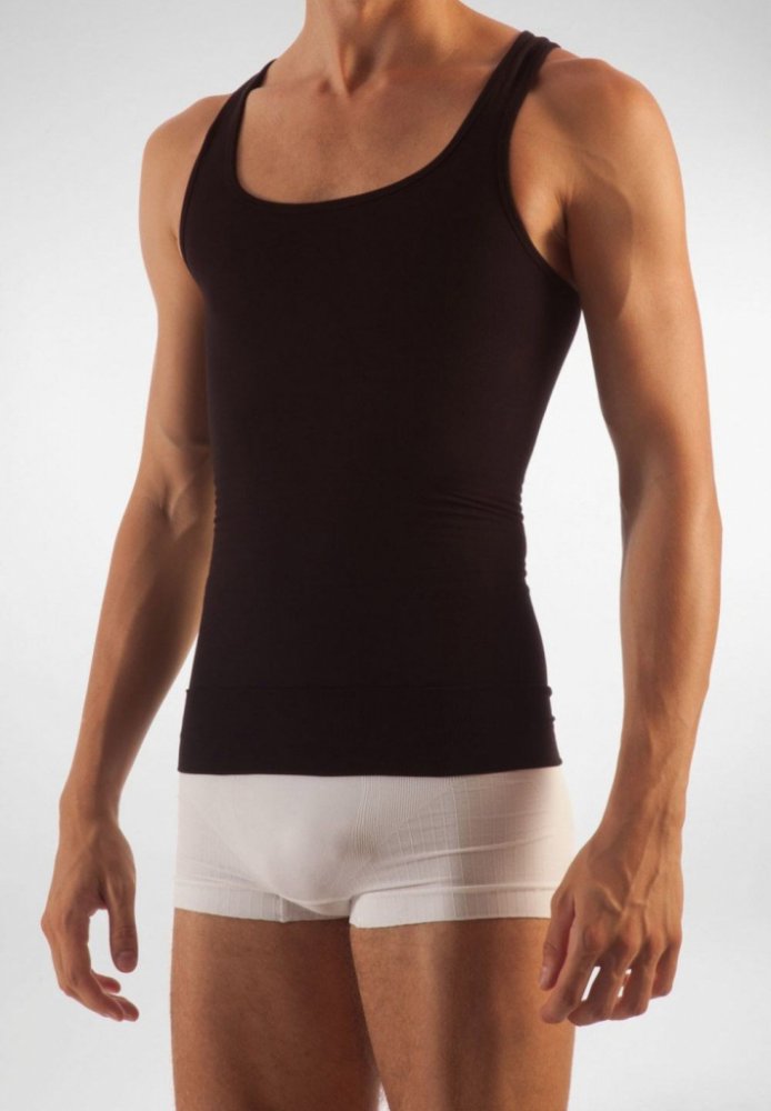 Zeštíhlující nátělník pro muže z elastické bavlny, se třemi vetkanými pásy. Tvaruje oblast břicha a boků. Bezešvé provedení pro maximální pohodlí. Ve spodním okraji je vetkána gumička, která brání shrnování nahoru. Nátělník je vhodný pod jakýkoliv oděv a je prakticky neviditelný.