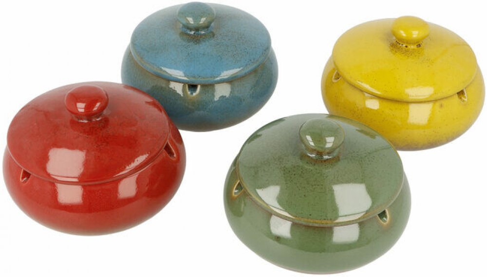 Venkovní cigaretový popelník Bright colors. Keramický popelník v různých barevných odstínech s leskle glazurovaným povrchem. Kulatý popelník má tři odkladová místa pro cigarety. Uvnitř najdeme trn pro "zhasnutí" cigarety. Rozfoukání popelu po okolí zabraňuje praktické víčko, kterým se popelník uzavře. Popelník je dodávaný v kartonové krabičce.