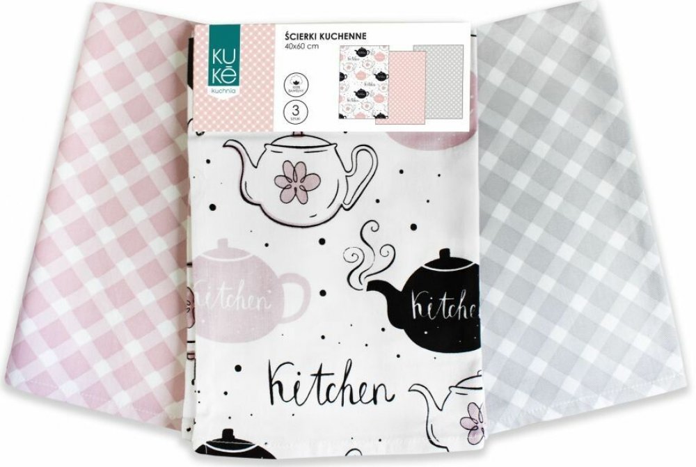 Kuchyňské utěrky Kuke s potiskem sada 3 ks Konvice. Stylová sada tří bavlněných utěrek Kuke s potiskem je praktickým pomocníkem i moderní dekorací vaší kuchyně. Kuchyňské utěrky Kuke s potiskem Konvice o rozměru 40×60 cm jsou vyrobené ze 100 % bavlny, mají dobrou savost a příjemný materiál. Díky kvalitnímu zpracování a elegantnímu designu se hodí pro každodenní použití i jako originální dárek.