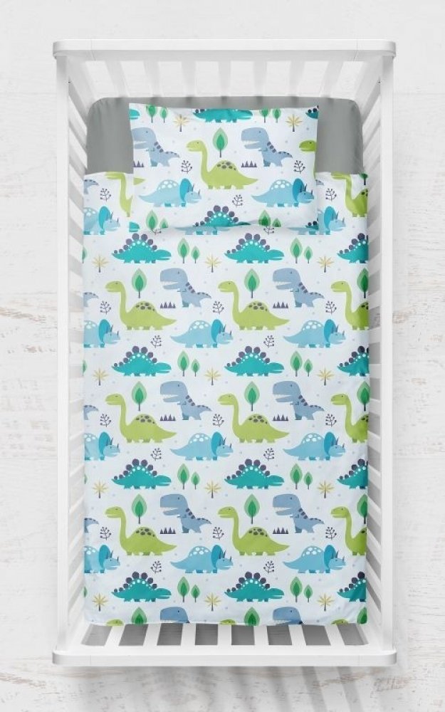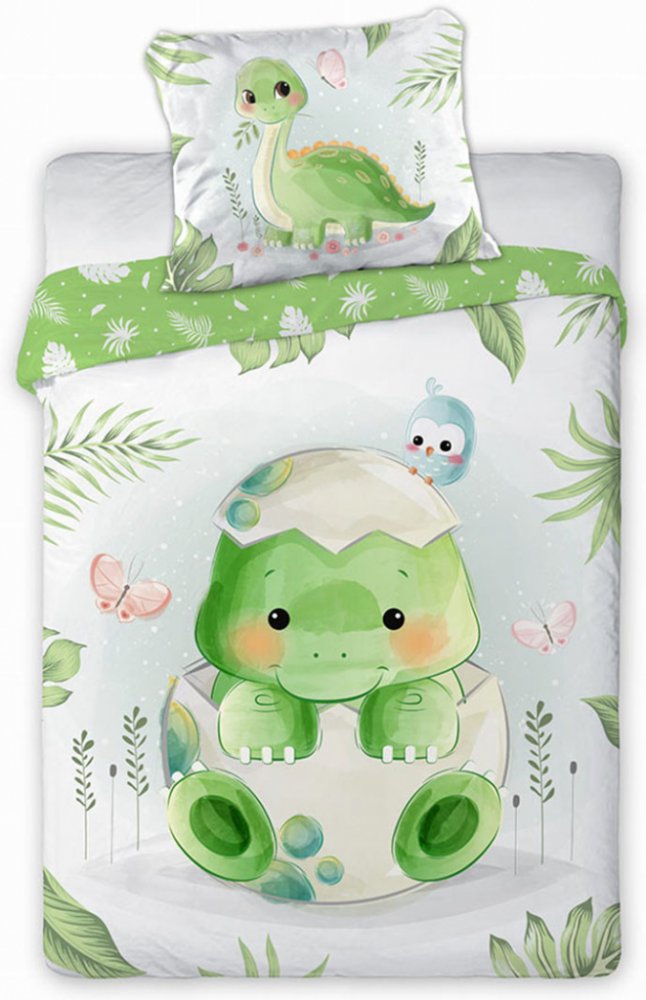 Bavlněné dětské povlečení do postýlky zdobí na přední straně právě vylíhnutý dinosauřík z vajíčka. Na zadní straně si může miminko prohlédnout zelené pozadí s listy trávy.