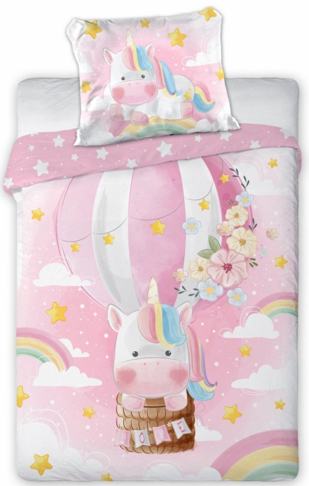 Bavlněné dětské povlečení z řady Cuddles Růžový jednorožec 100x135, 40x60 pro malé princezny. Toto roztomilé povlečení do malé postýlky má potisk z obou stran odlišný, jak je vidět na fotografii. Dopřejte svým nejmenším miláčkům spánek ve veselém barevném povlečení, které je ušito ze 100% hladké bavlny.