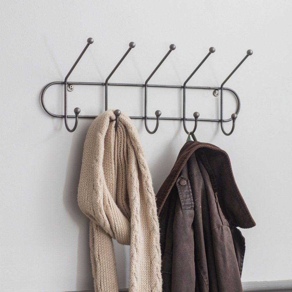 Industriální kovový věšák na stěnu Farringdon od britské značky Garden Trading představuje praktický doplněk do každé chodby i předsíně. Nese 5 klasických háčků na konci zakončených kuličkou o nosnosti 2 kg a 5 šikmých háků, které slouží k zavěšení šál a šátků. Jednoduché a čisté linie v kombinaci s ručně svařovaným železem tvoří top kombinaci. Pozn. kov je opatřen lakem, nicméně na několika místech prosvítají železné plošky, věšák si tak ponechal svou osobitou surovost.