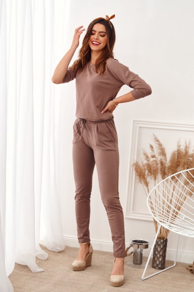Dámský overal s kulatým výstřihem a tříčtvrtečním rukávem. Zapínání je v zadní části pomocí stříbrného zipu. Overal je v pase na šňůrku a má dlouhé nohavice s postranními kapsami. Je vyroben z hladké, lehce elastické látky. Ideální pro každodenní nošení, na výlet či do práce. Hodí se ke sportovní obuvi i vysokým podpatkům.