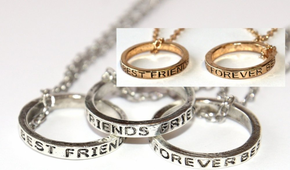 Tyto oblíbené řetízky pro nerozlučné přátele, jsou s přívěskem ve tvaru prstenu. Na lemu každého z nich je nápis "Best friends forever" ♥