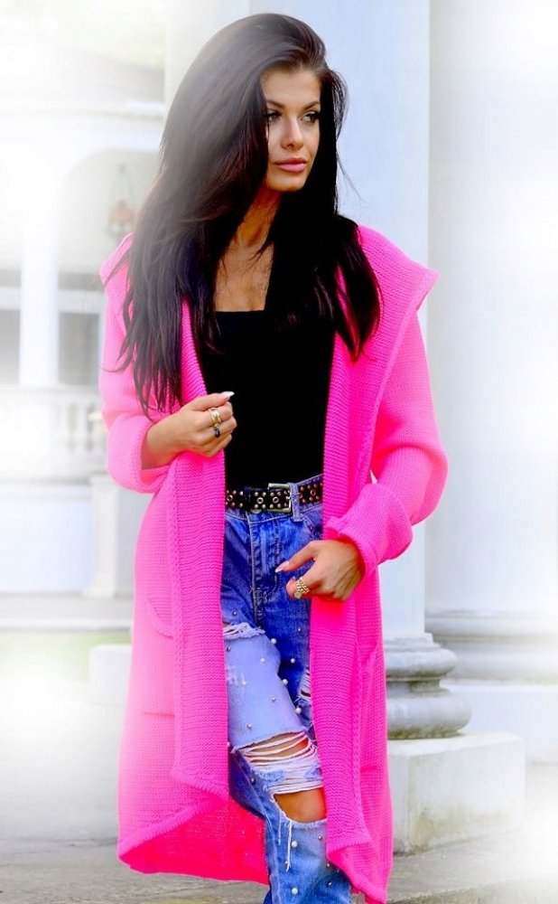 Fashionweek Mega pletený svetr kabát s kapuci NEON TREND HEVEN Růžový neon