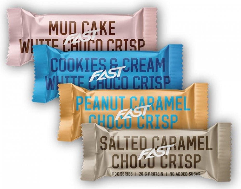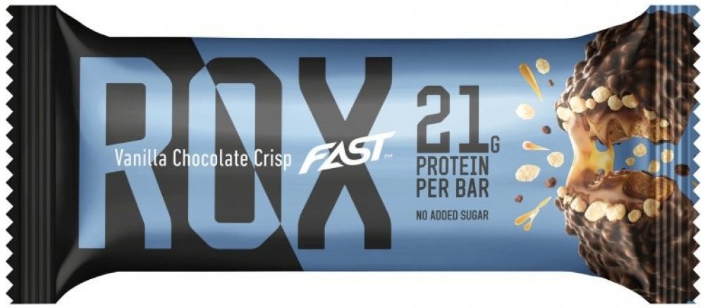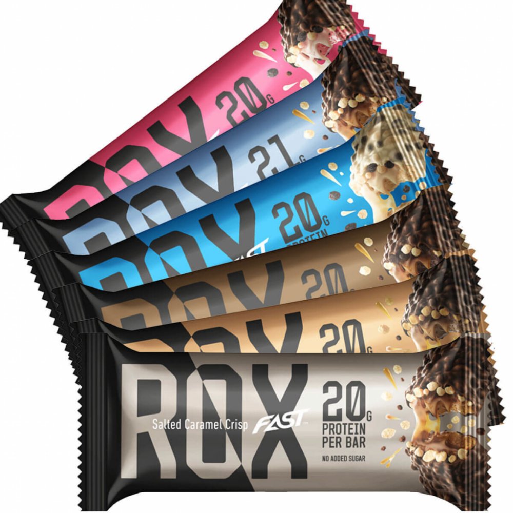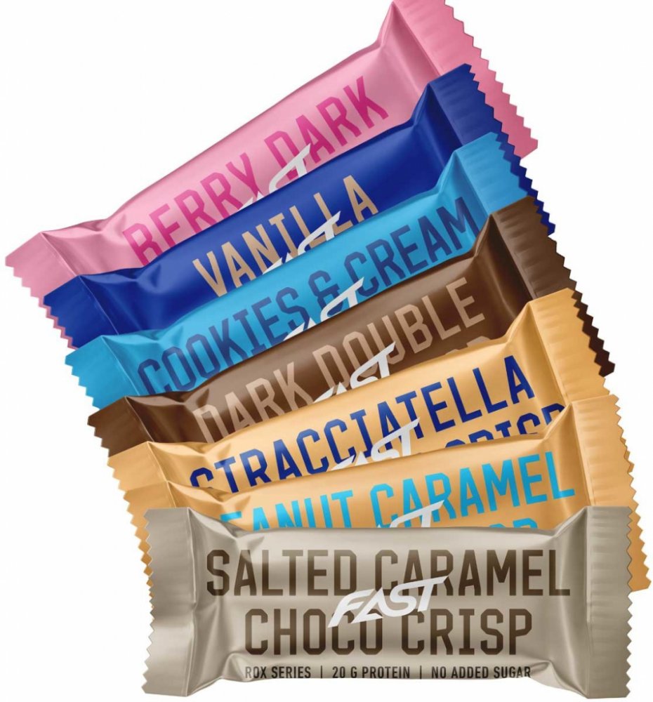 Vícevrstvé tyčinky FAST ROX obsahující 20g bílkovin jsou k dispozici v osmi lahodných příchutích: Vanilla-chocolate crisp, Dark chocolate Crisp, Salted caramel Crisp, Peanut caramel Crisp, White chocolate and cookies & cream, Stracciatella choco chip crisp, Berry chocolate Crisp a Salted liquorice crisp.