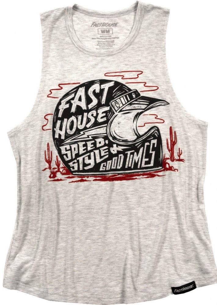 Dámské stylové tílkoFasthouse Women´s Dust Devil Muscle Tank je ušito z nízko gramážního úpletu kombinace polyesteru a rayonu Potisk brandových prvků pomocí metody discharge ink. Volný střih, velké postranní průřezy pro ruce a lehký materiál je ideální pro letní měsíce.