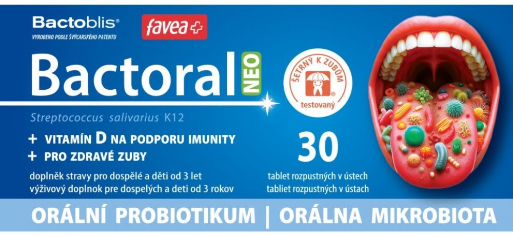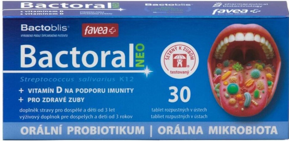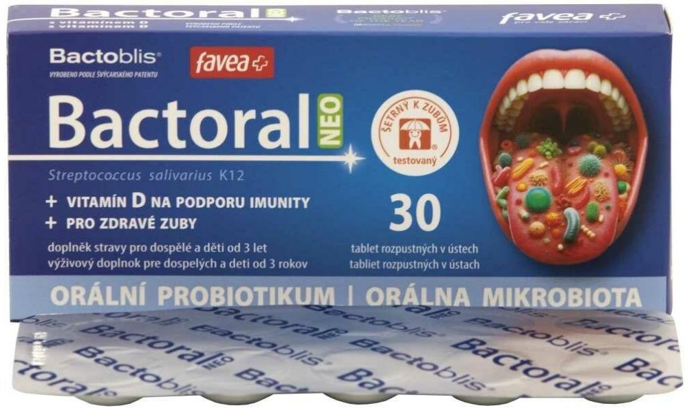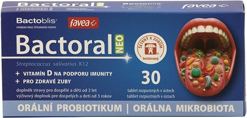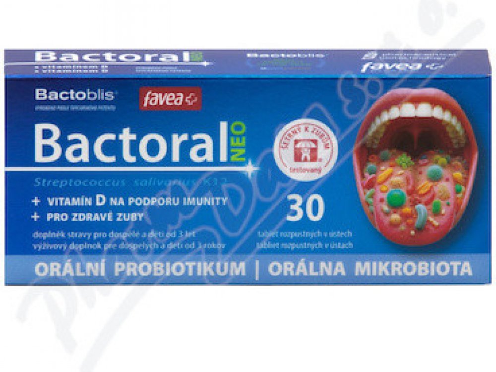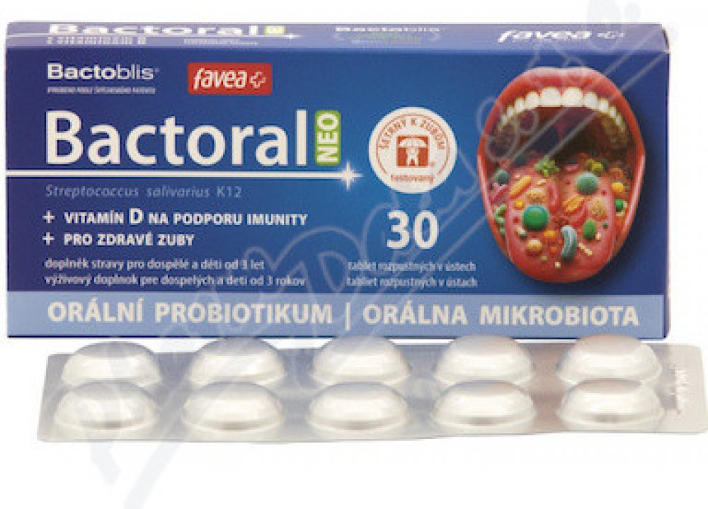 První orální probiotikum pro doplnění přátelské mikrobioty krku a dutiny ústní. Obsahuje probiotickou kulturu Streptococcus salivarius K12, která tvoří peptidy salivaricin A2 a salivaricin B tzv. bakteriociny. Tato bakterie dokáže zaujmout strategické pozice v dutině ústní, nosohltanu a středouší a dokáže vytěsnit nežádoucí druhy. Studie dokazují, že Bactoral je schopen kolonizovat dutinu ústní a ...